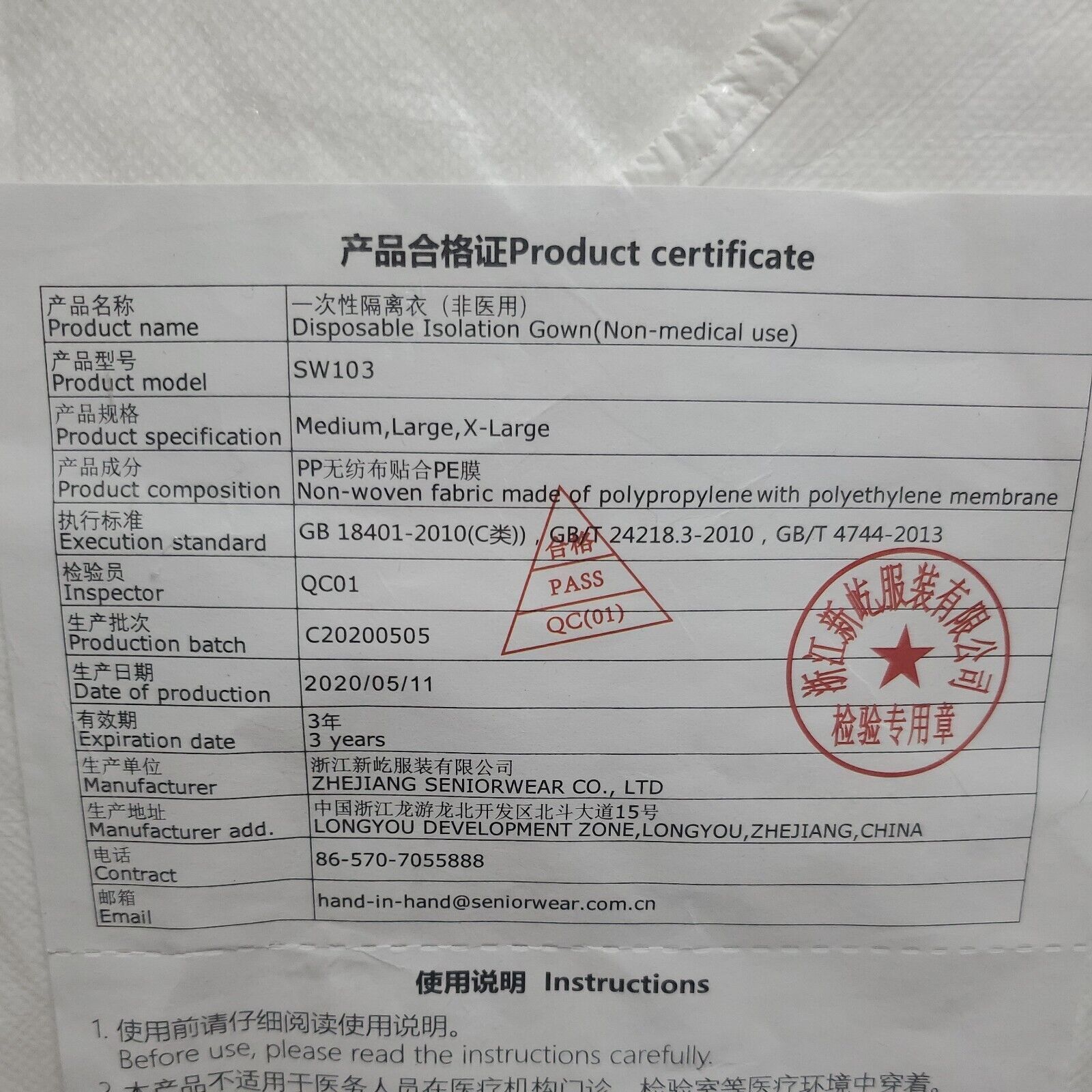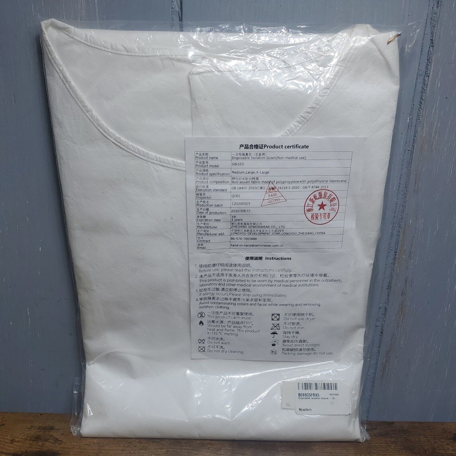 Disposable Isolation gown barrier Polypropylene XL