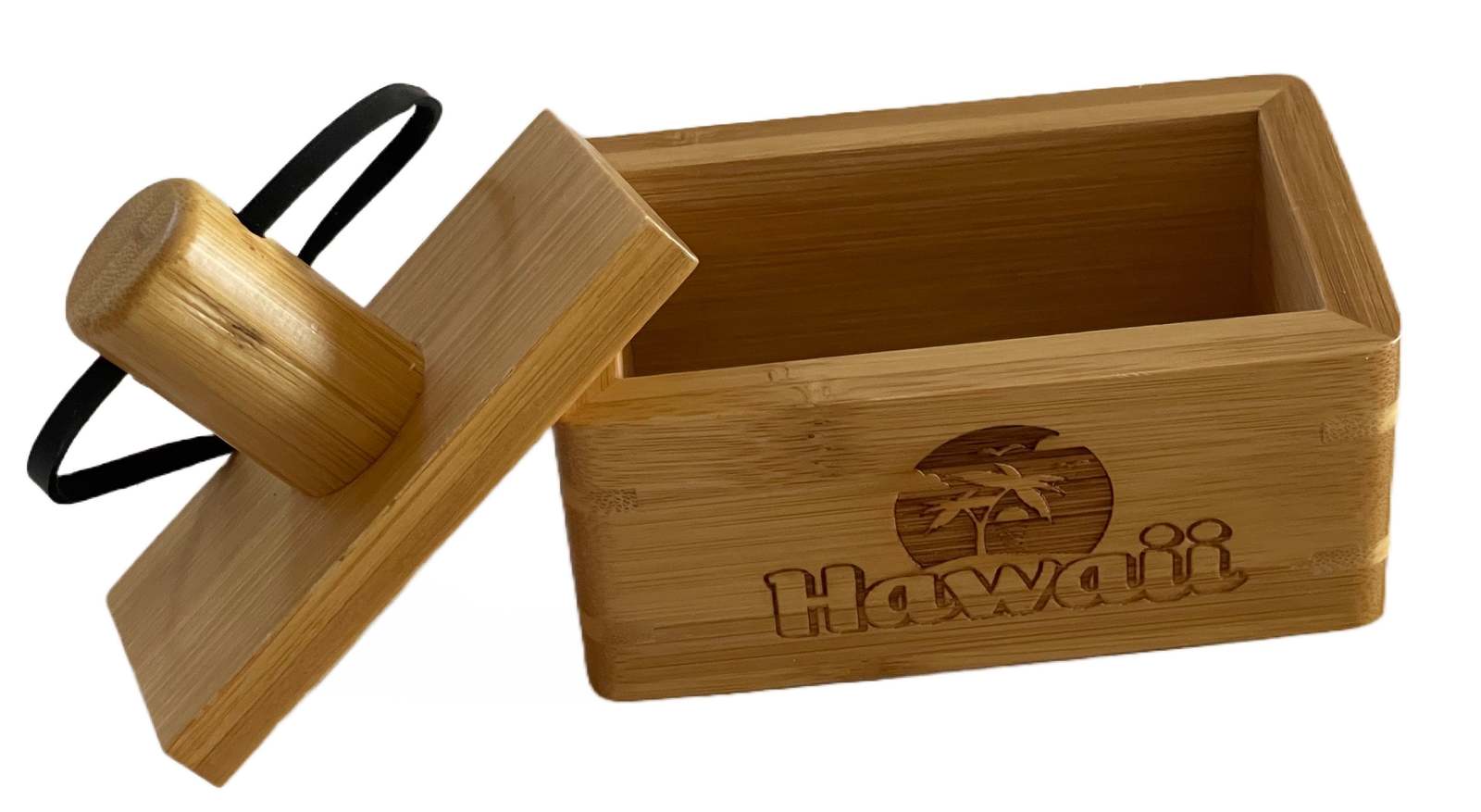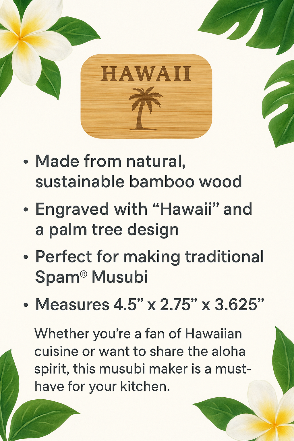 Bring the flavors of Hawaii to your kitchen with the Aloha Bamboo Hawaii Musubi Maker! Expertly crafted from natural, sustainable bamboo wood, this musubi maker is both functional and beautiful, featuring an engraved "Hawaii" and palm tree design on the front. Perfect for creating the iconic Hawaiian treat, Spam Musubi, this tool also makes a thoughtful gift when paired with a can of Spam and nori.