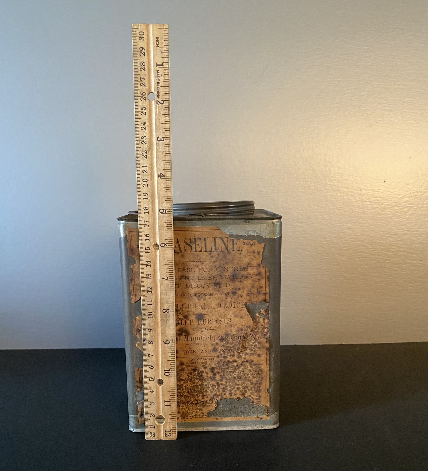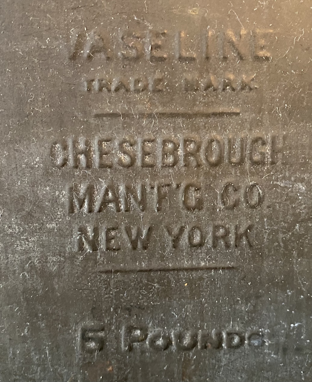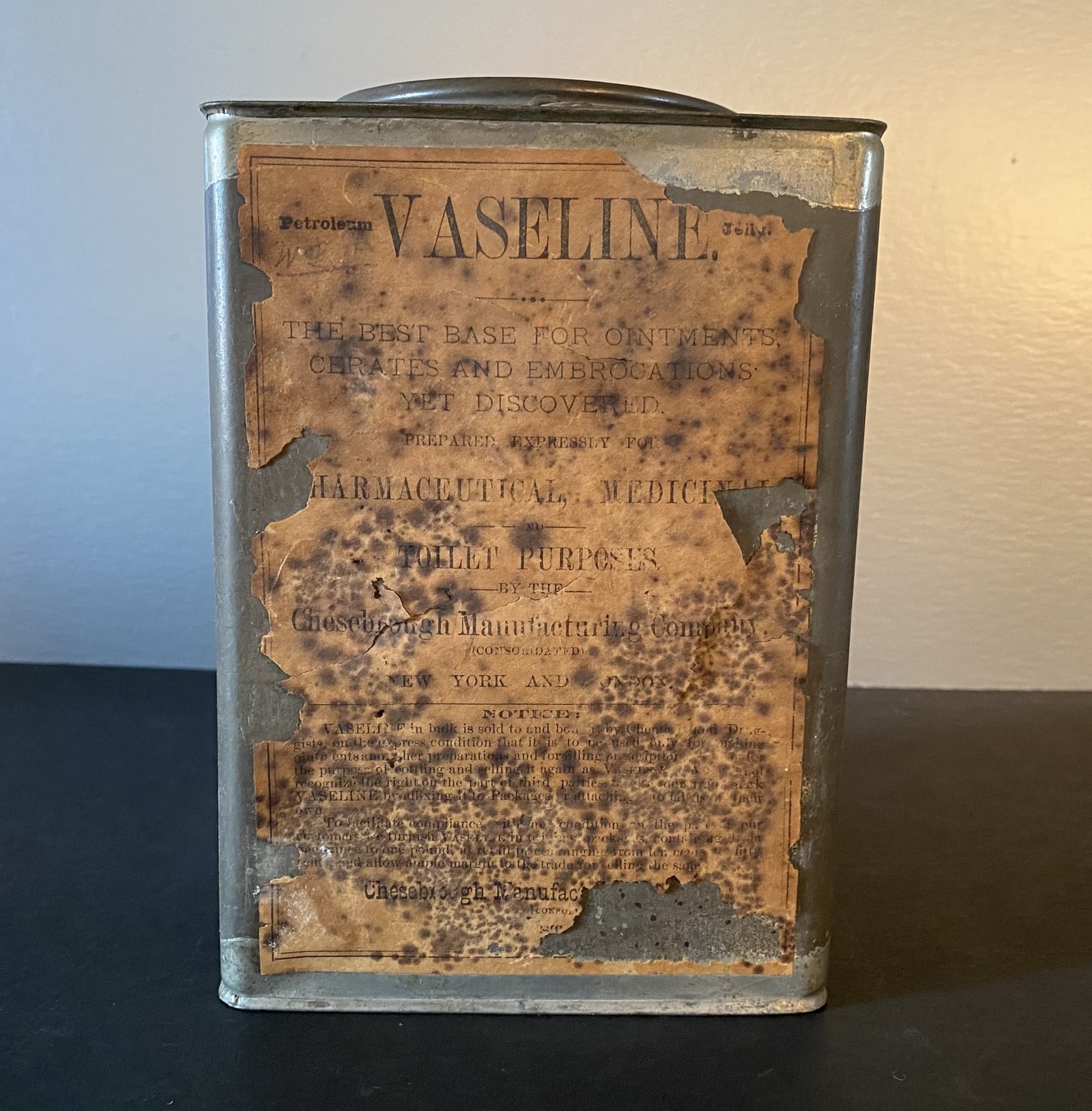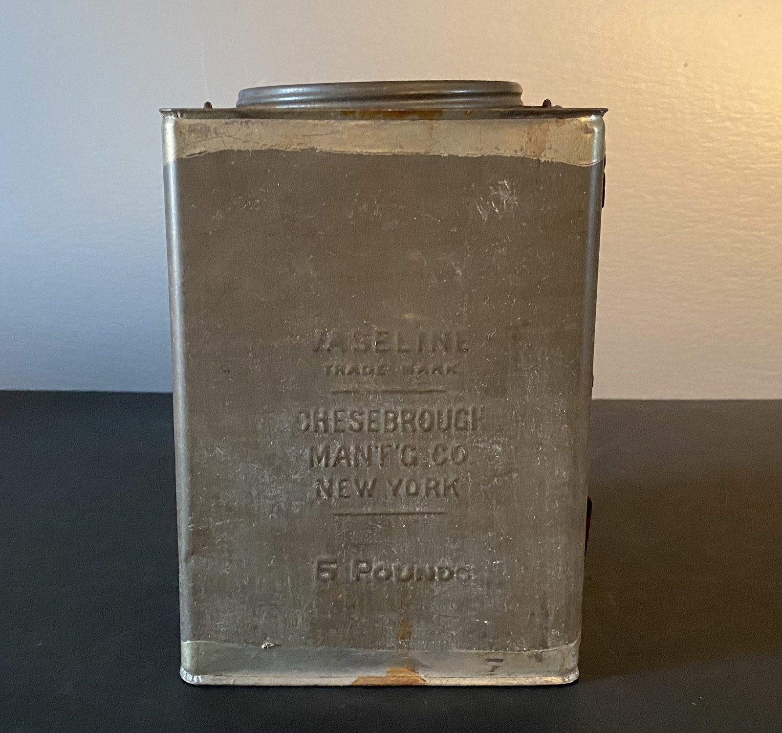 This listing features a vintage Cheesebrough 5 lbs Vaseline Tin from the early 1900's. The can is embossed on one side and has a very partial label on another. Some of these cans were made up as late as WWII however, the later tins have "Made in the USA" embossed on them, this one does not indicating this tin is much earlier.