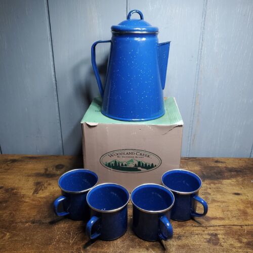 This set includes a charming blue Woodland Creek enamel coffee mug, perfect for your morning cup of joe. Along with the mug, the set also includes a matching coffee pot for easy brewing and serving. The mugs are made with high-quality enamel and feature a Woodland pattern, adding a rustic touch to your kitchen collection. Whether you're a coffee lover or simply looking to add to your dinnerware set, these mugs are a must-have.