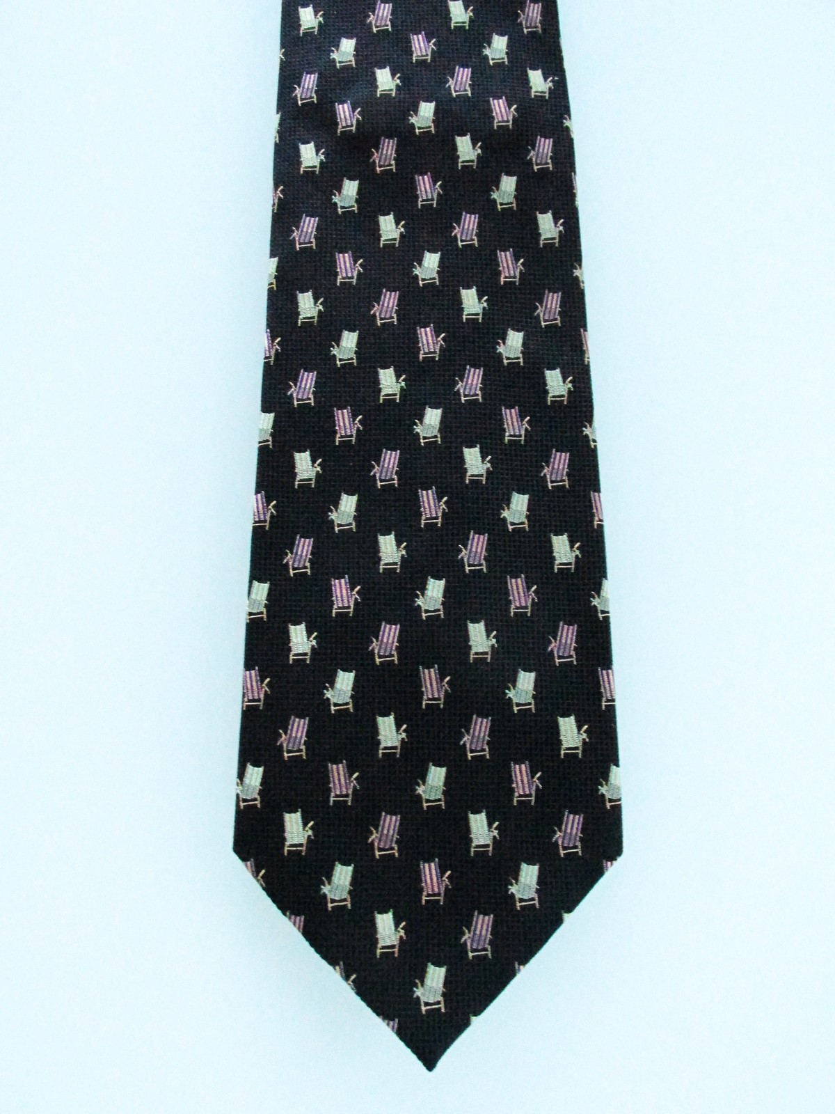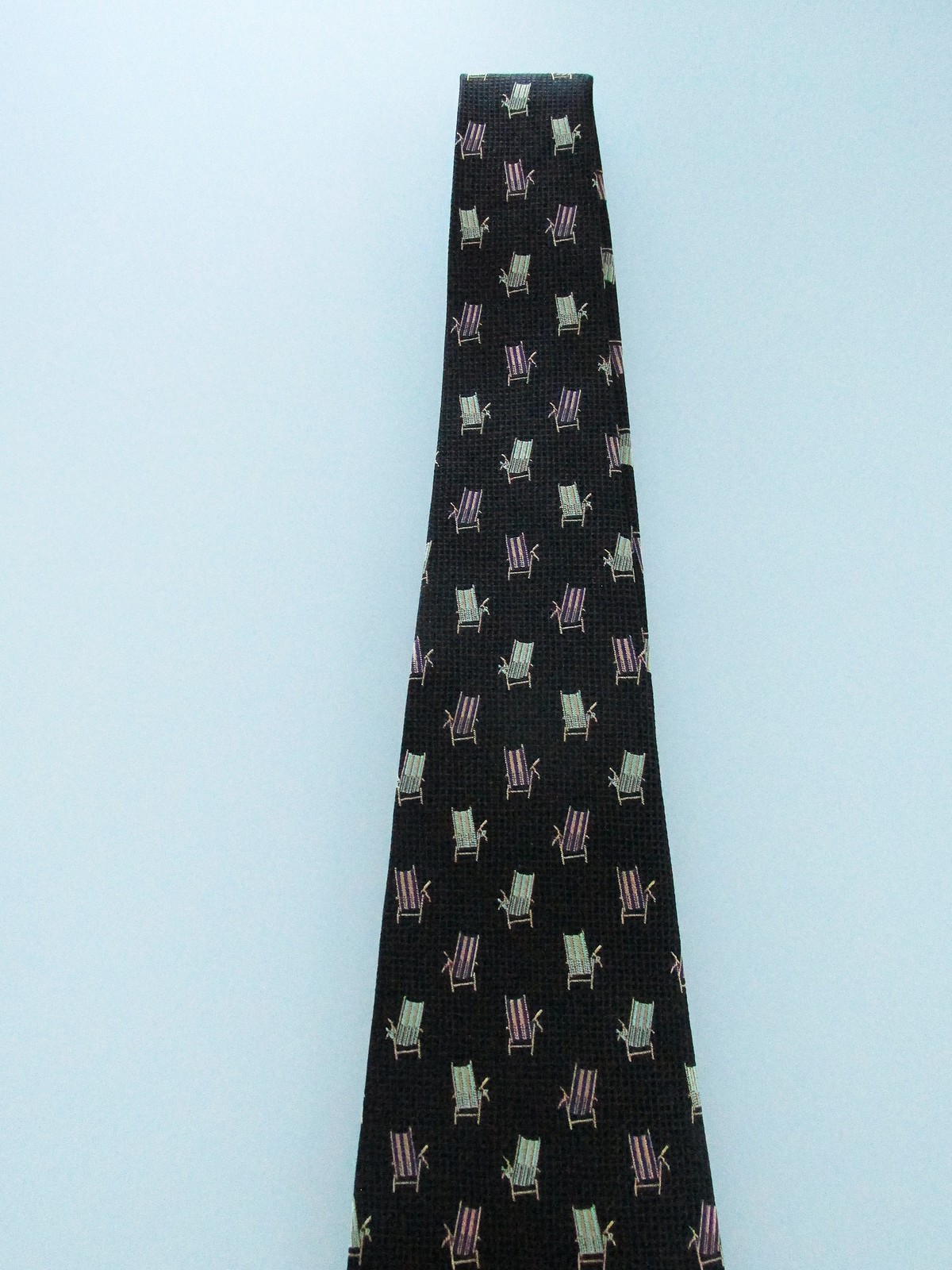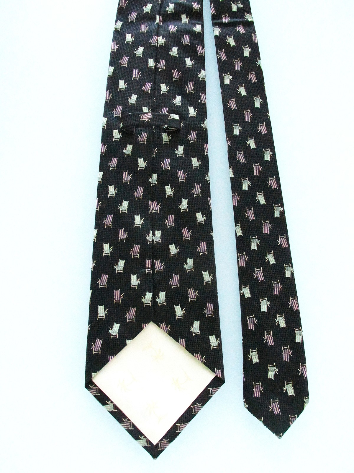 Description: Up for sale is a Tommy Bahama brand men's silk tie. It is handmade of 100% silk. The dimensions are approximately 57" long x 4.00" wide. It has a multicolored beach chair motif in lite pink, gold mint green on a black background. This tie is in excellent condition.