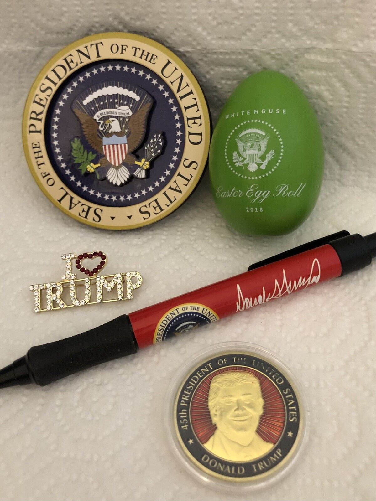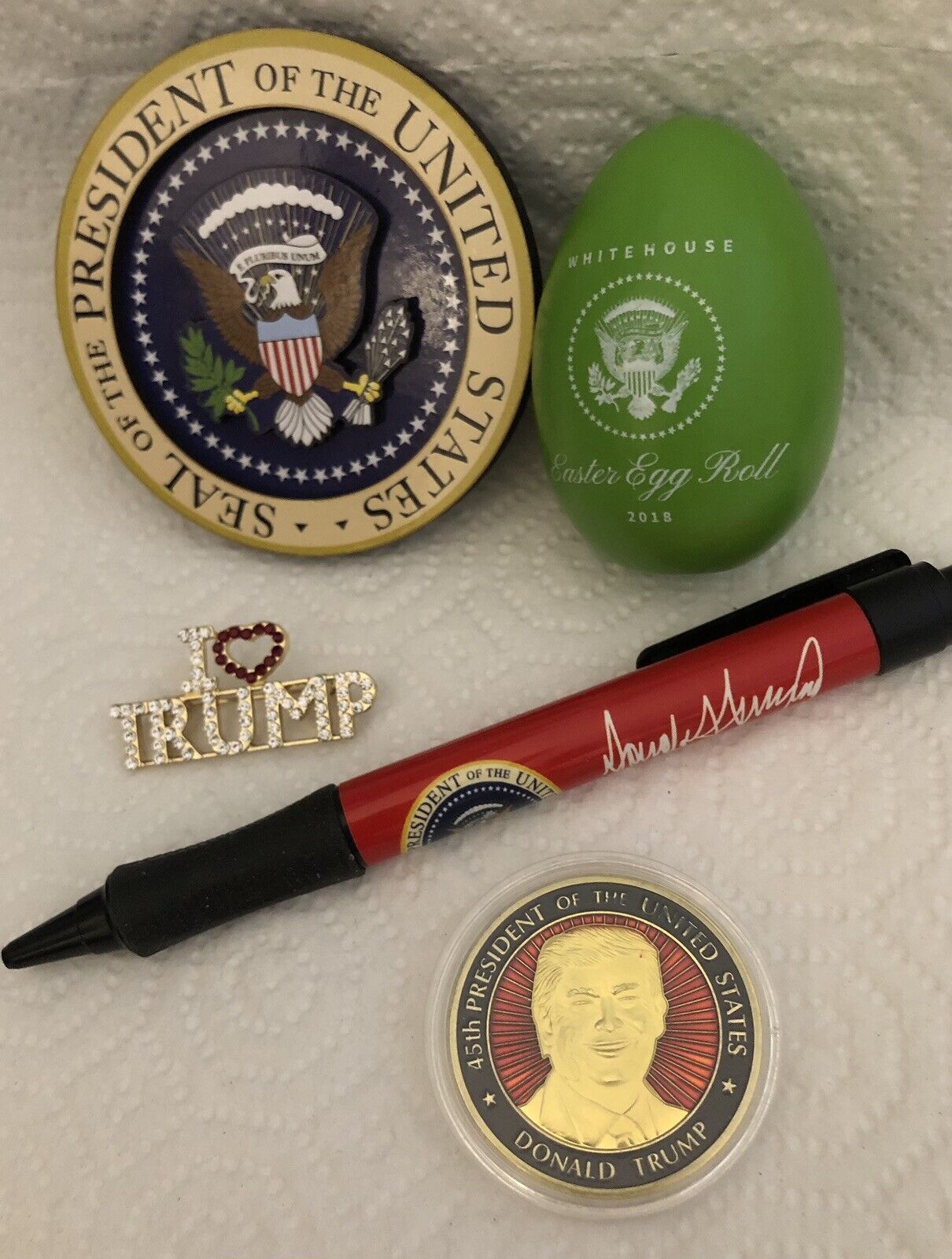 sale IS FOR ONLY THE 2018 EGG Without BOX , WHITE HOUSE MAGNET , RED PEN, COIN, PIN I LOVE TRUMP.,..IN 1st PHOTO .