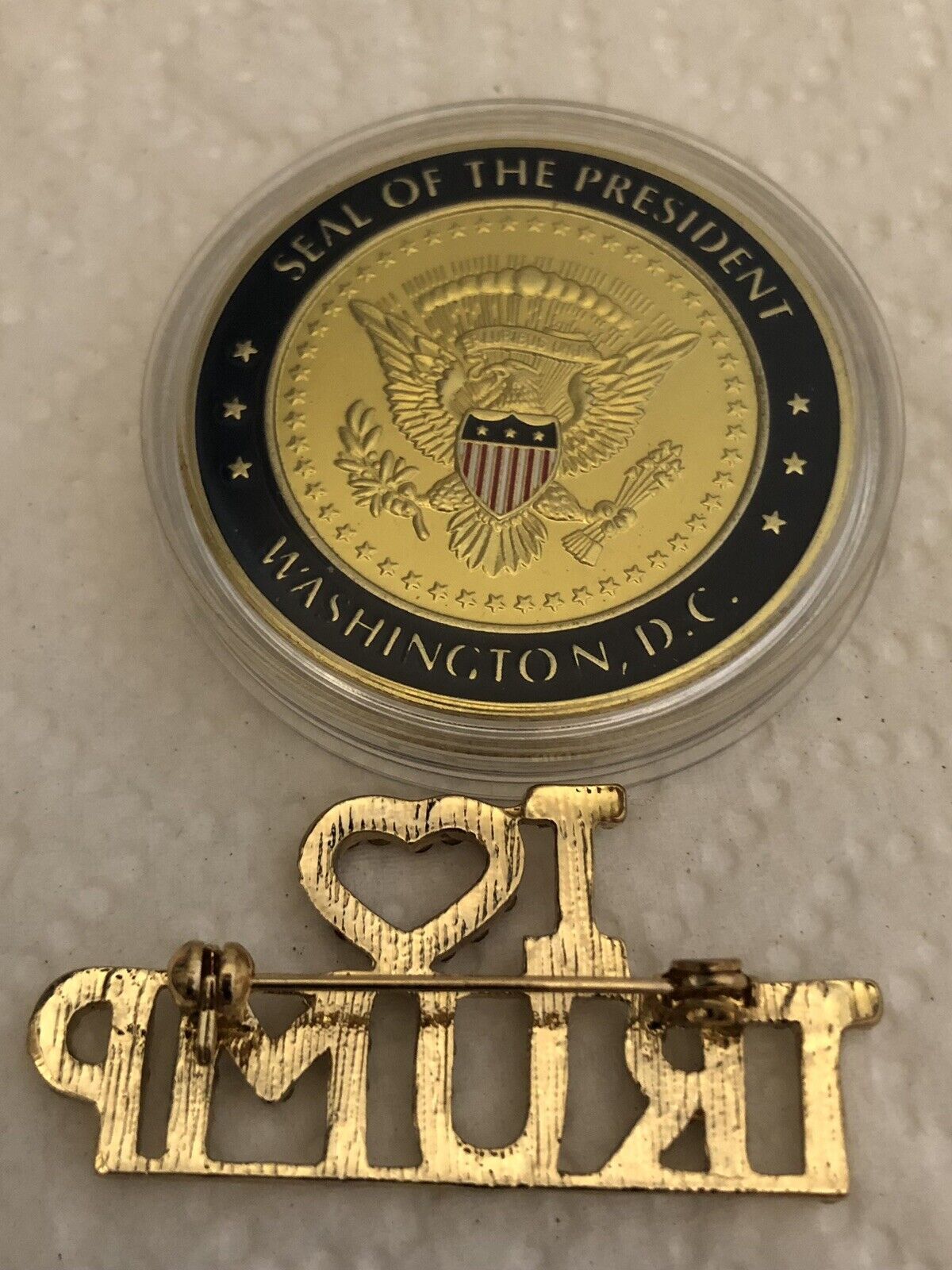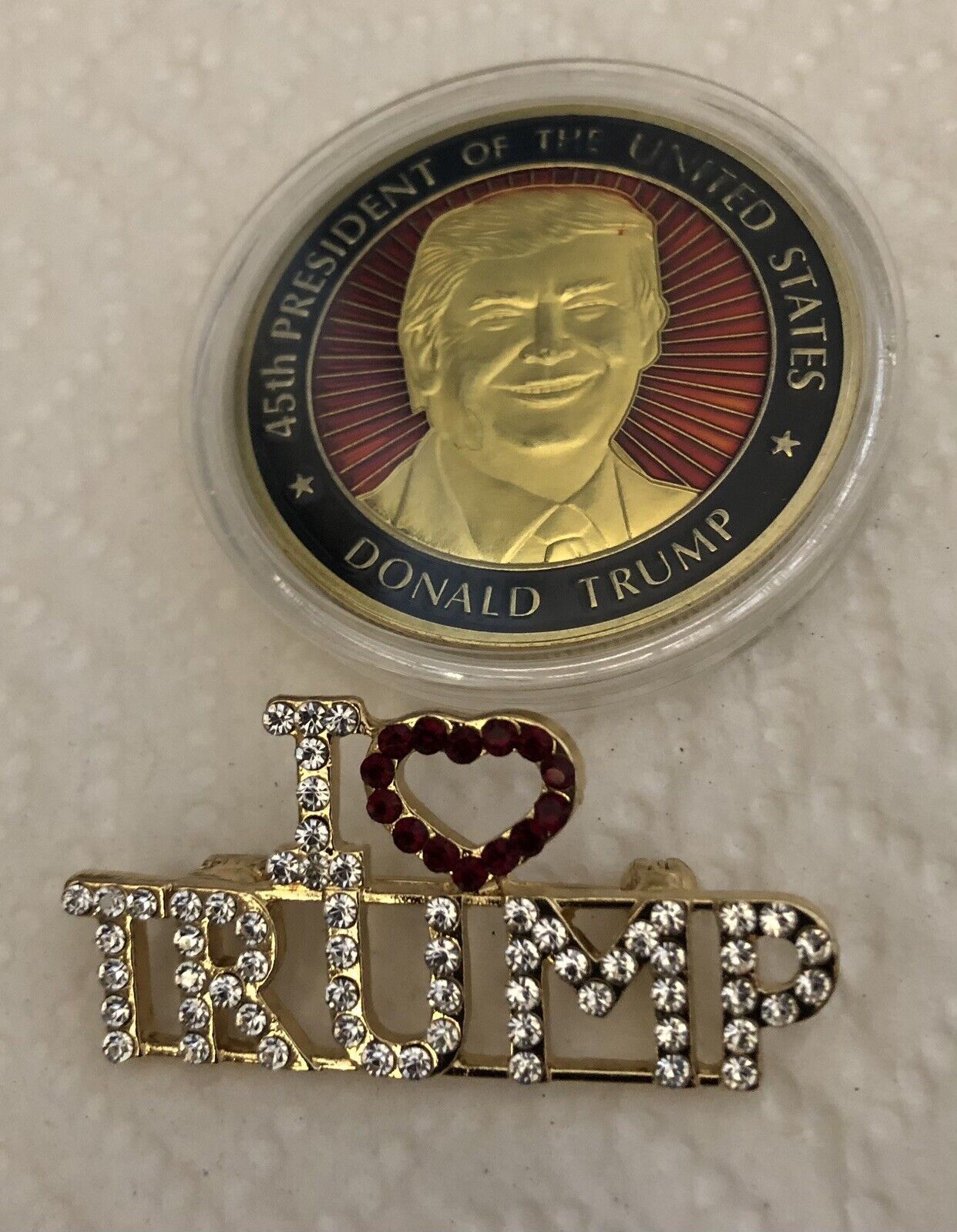 MAGNET…PLUS I ??TRUMP BRILLIANT RHINESTONE 1 1/2” x 3/4” PIN PLUS TRUMP CHALLENGE COIN IN CLEAR CASE PLUS QUALITY RED PEN WITH DONALD TRUMP NAME..