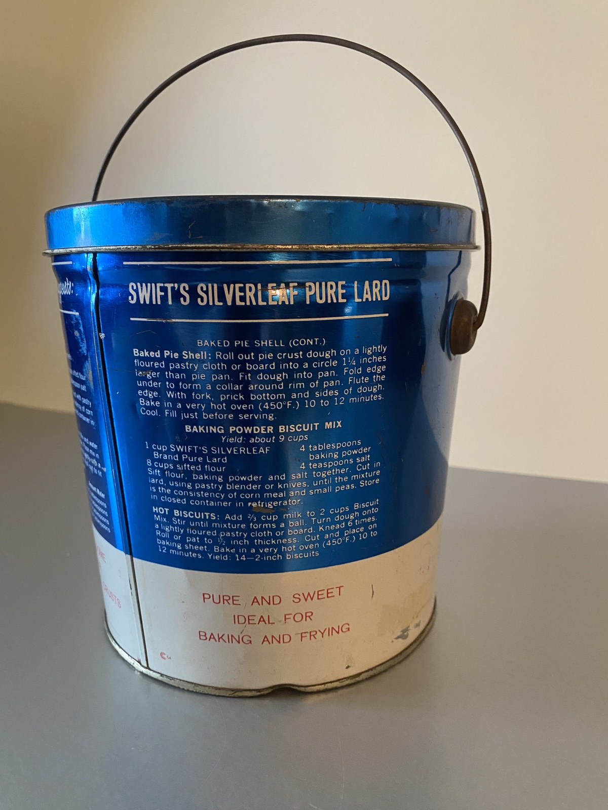 This listing features a Vintage Swift's Silverleaf Lard Tin from the1930's. Aside from a few dings and minor scratches this tin is in remarkable condition. Please see our pictures.