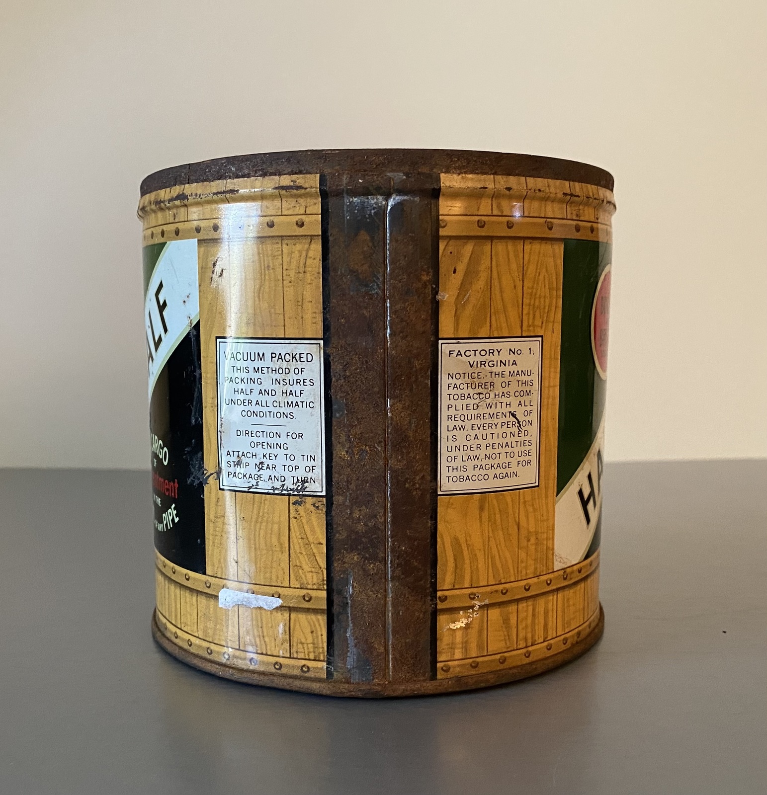 This listing features a 1950's Burley and Bright “Half and Half” Tobacco Tin Canister. This tin displays well, with a few minor markings on the can. It is in overall good condition, and woul be a nice addition for any collector! Made by the American Tobacco Company in Richmond, VA.