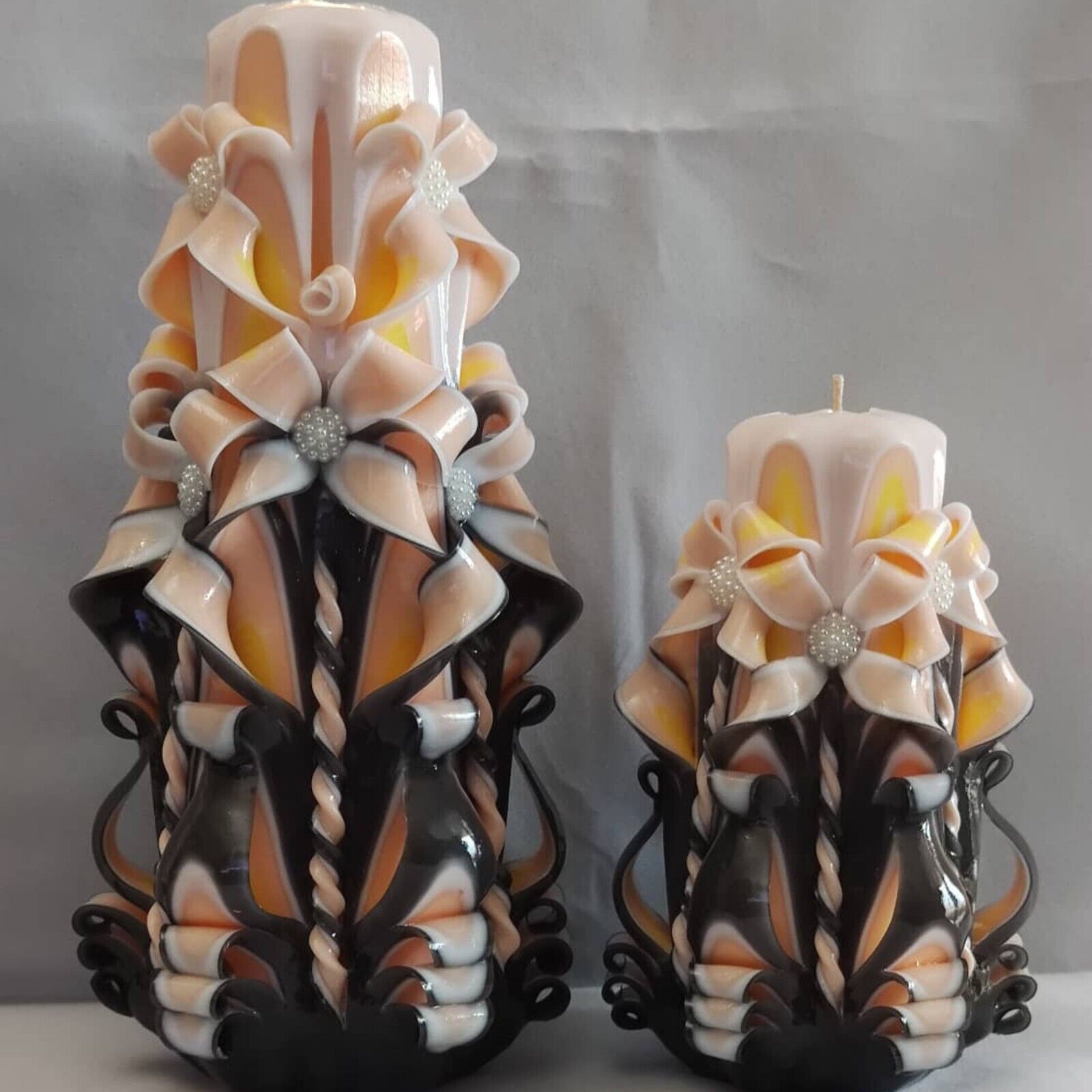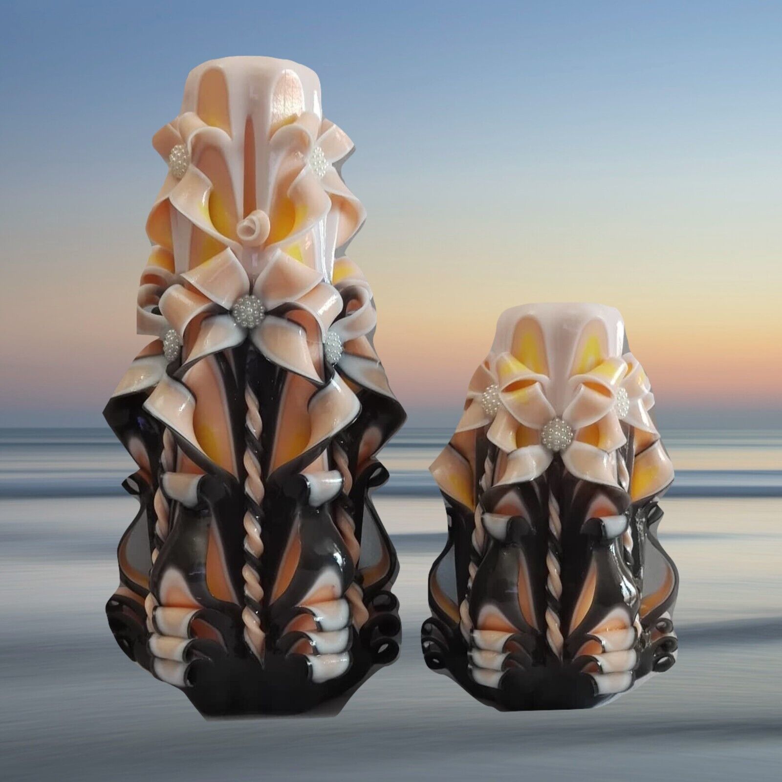 The handmade carved candles are made of paraffin and colored with vibrant, non-toxic pigments, specially formulated for use with paraffin. The finished candles are covered with a water-based candle lacquer to produce a scratch and dust resistant, beautiful, high-gloss finish.Your carved candles are packed securely.