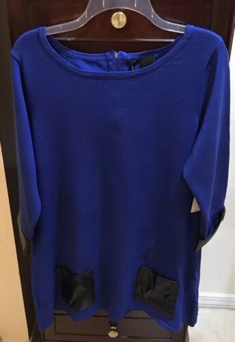 Women's New Directions Crew Neck 2/3 Sleeve Blouse Sz Lg Faux Leather Delphinium Blue two front pockets