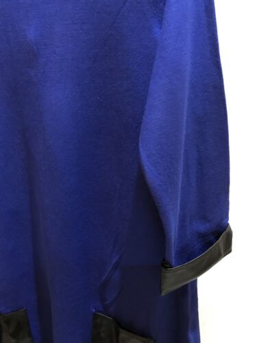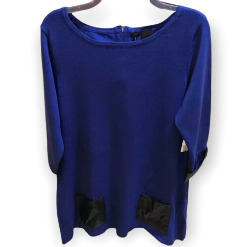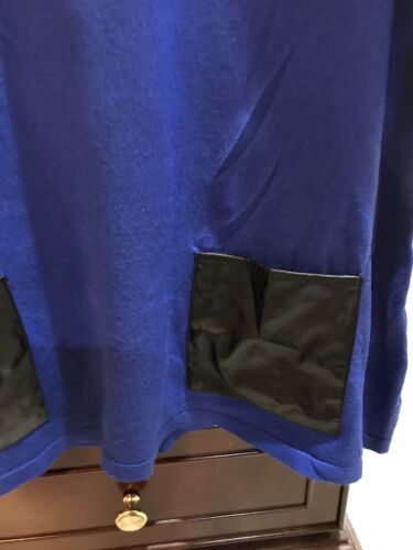 Women's New Directions Crew Neck 2/3 Sleeve Blouse Sz Small Faux Leather Delphinium Blue two front pockets
