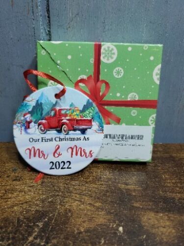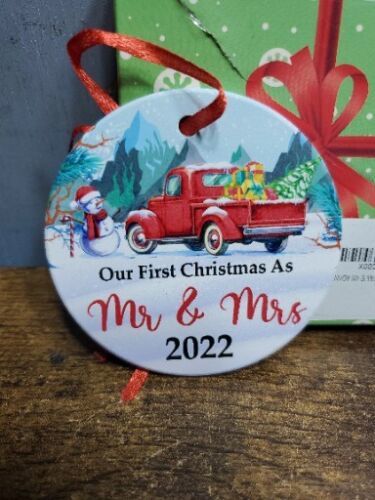 Celebrate your first Christmas as a couple with this charming ornament. The ceramic ornament features a red truck with "Our First Christmas Mr Mrs 2022" written on it, making it a wonderful keepsake for your first holiday season together. The ornament is 4 x 4 inches, circular in shape, and multicolored, making it a great addition to your holiday decor.