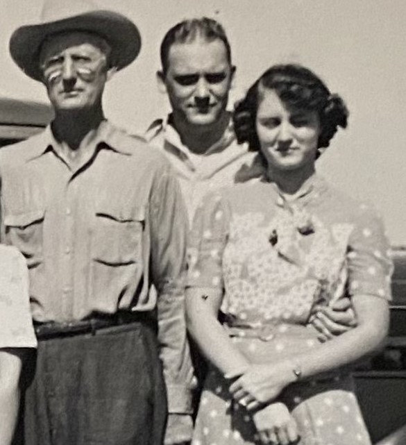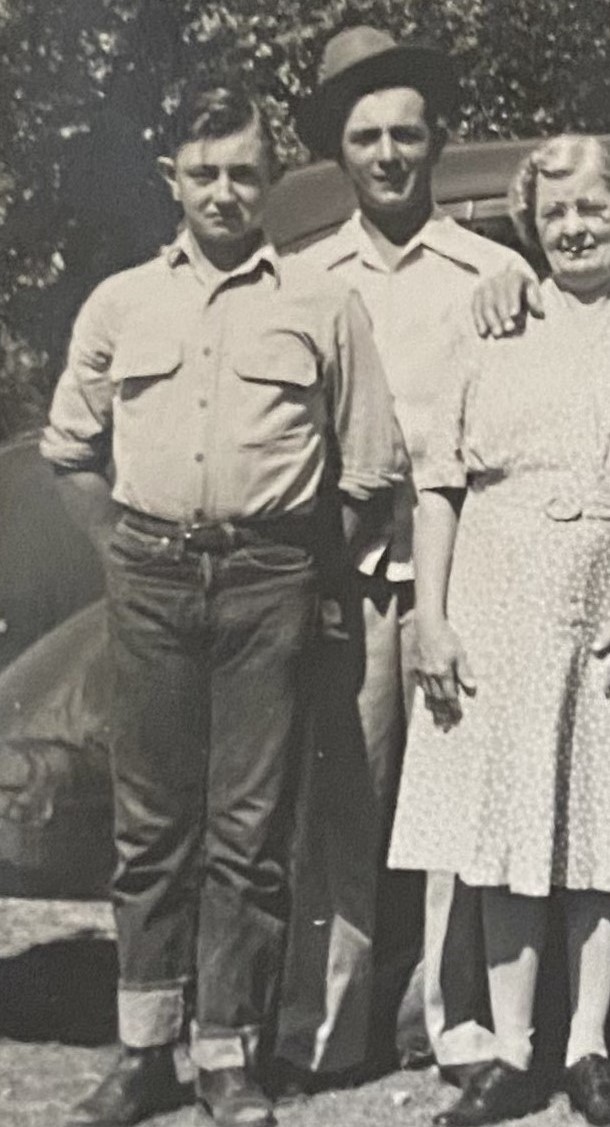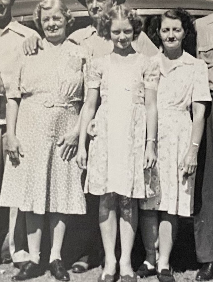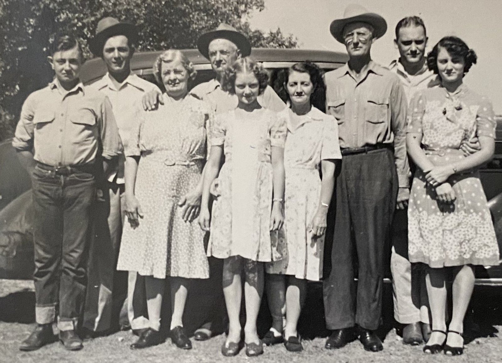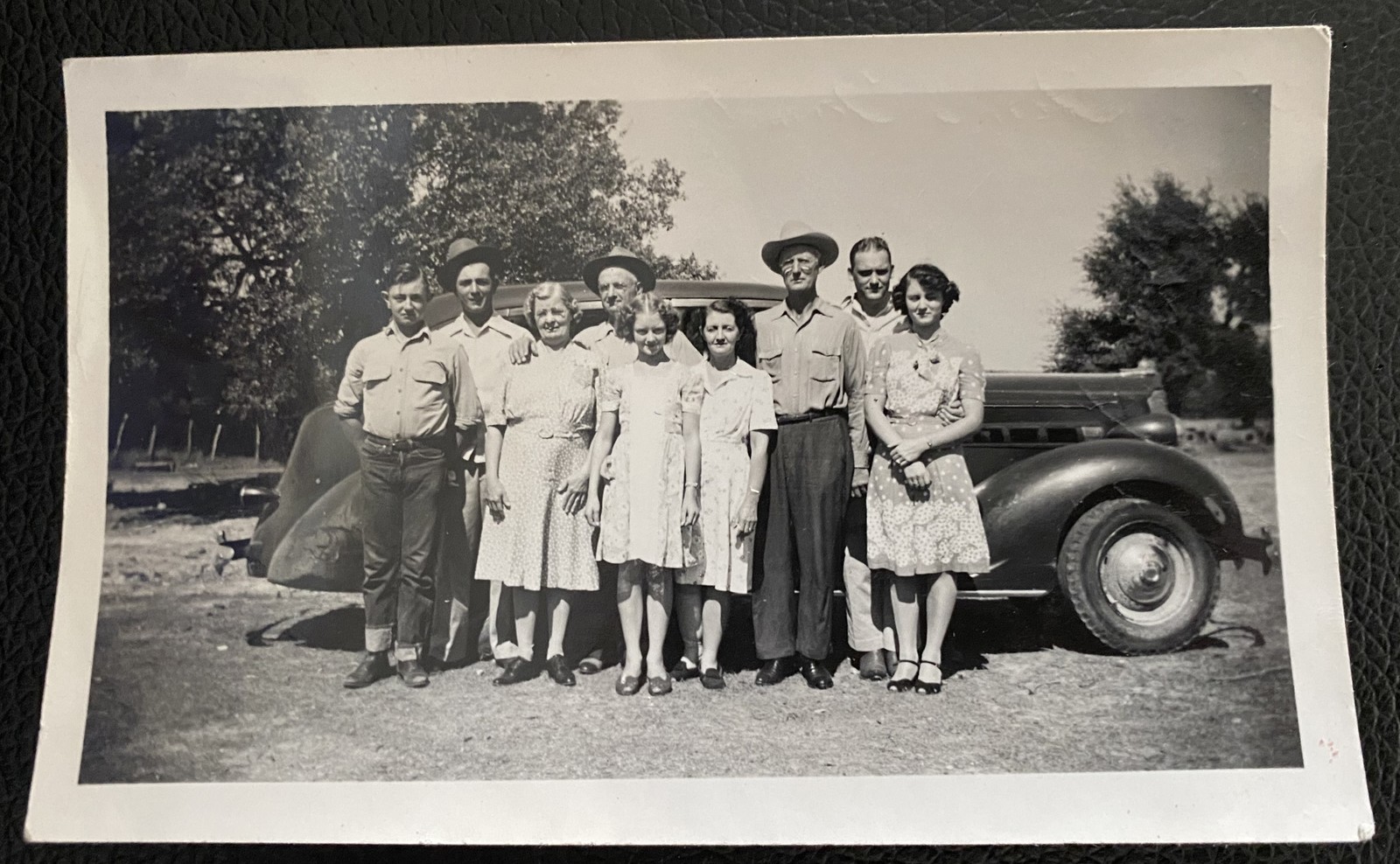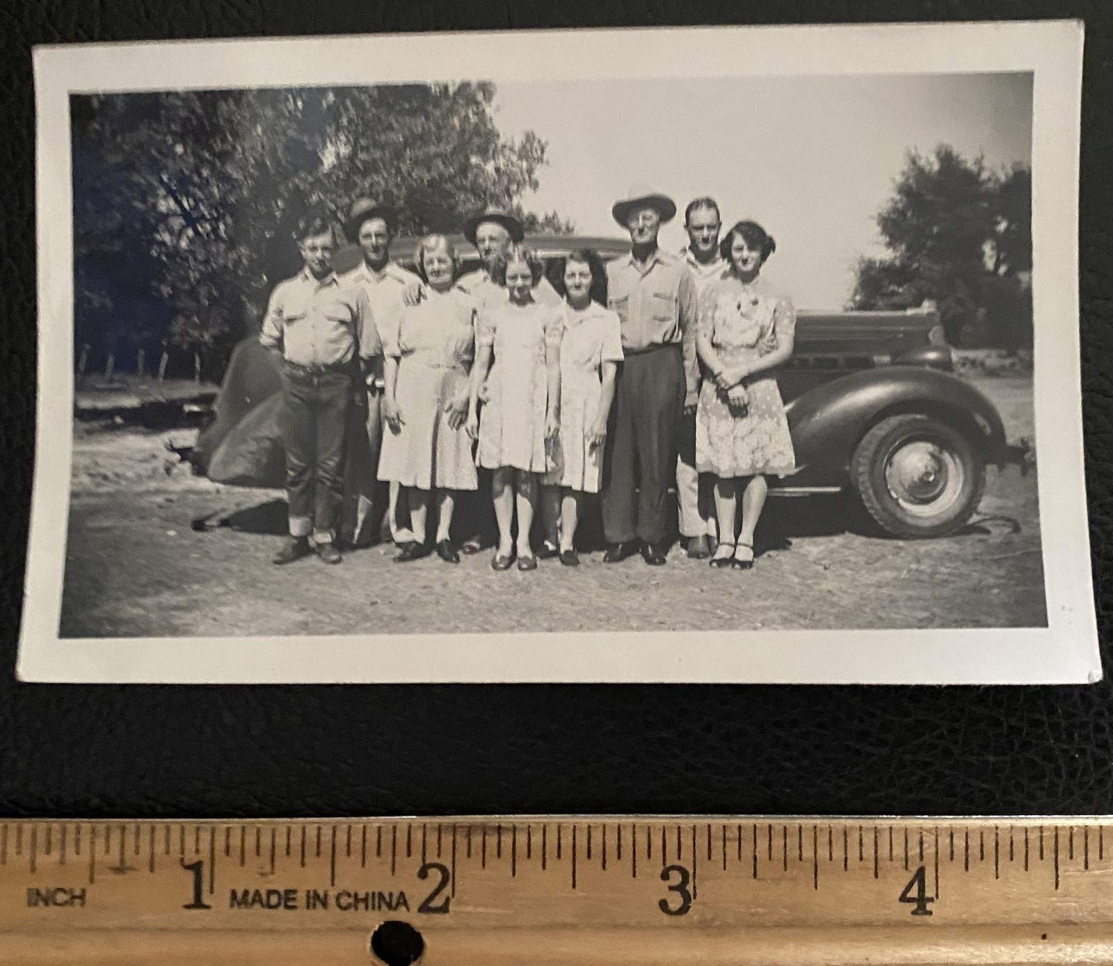 B&W Jones Family Portrait Photo in Front Of A 1940's Cadillac Sedan