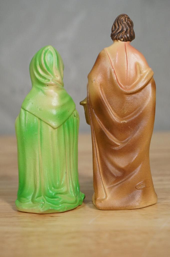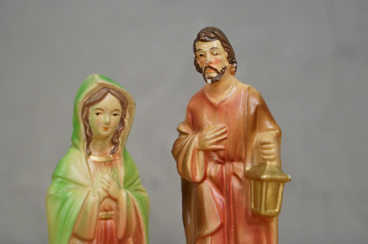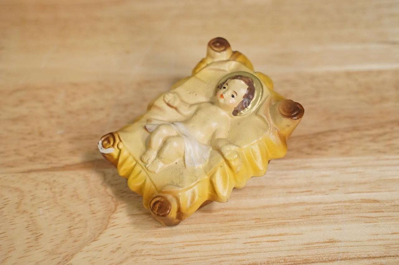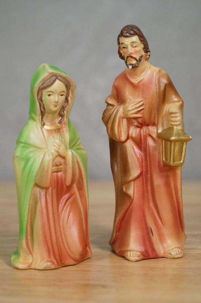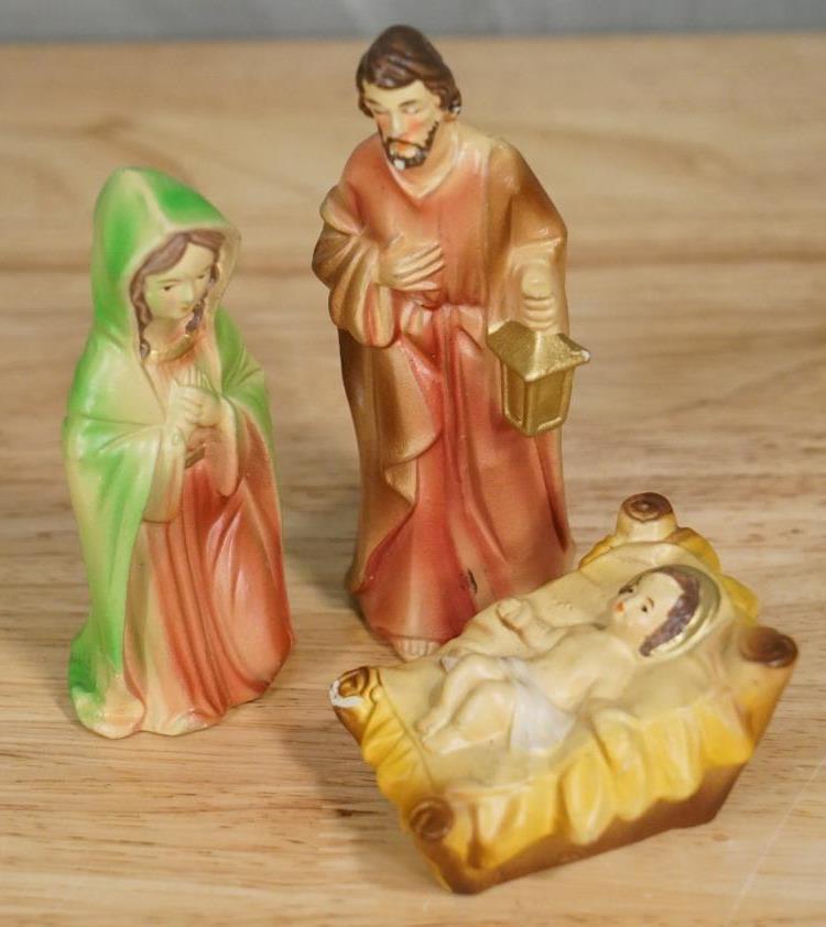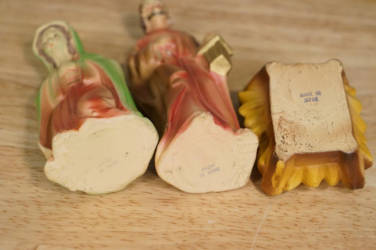 Vintage Christmas Nativity 3PC Lot Religious Figurines Mary Joseph Baby Jesus. No smoke or pet odor. Stamped Japan on the base. One flat chip on the edge of the manager. Joseph has a few spots of loss on his face. Mary looks good. Joseph is 5" tall as a size reference.