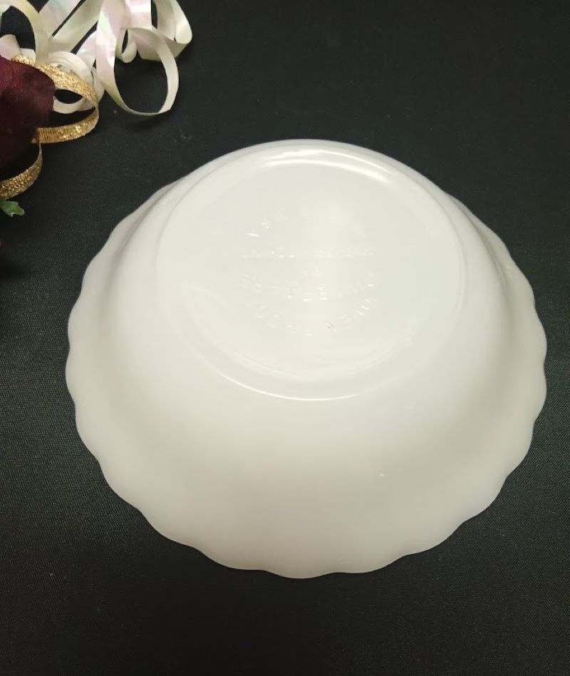 Up for your consideration is a very nice 4.75" fruit bowl, could also be used as a sauce bowl. It does have a smooth edge instead of sculpted. This pattern was made from 1949 to 1962. On the back is stated OVEN PROOF DINNERWARE BY ANCHOR HOCKING 30 MADE IN U.S.A. What a elegant but simple pattern to display on your dinner table.