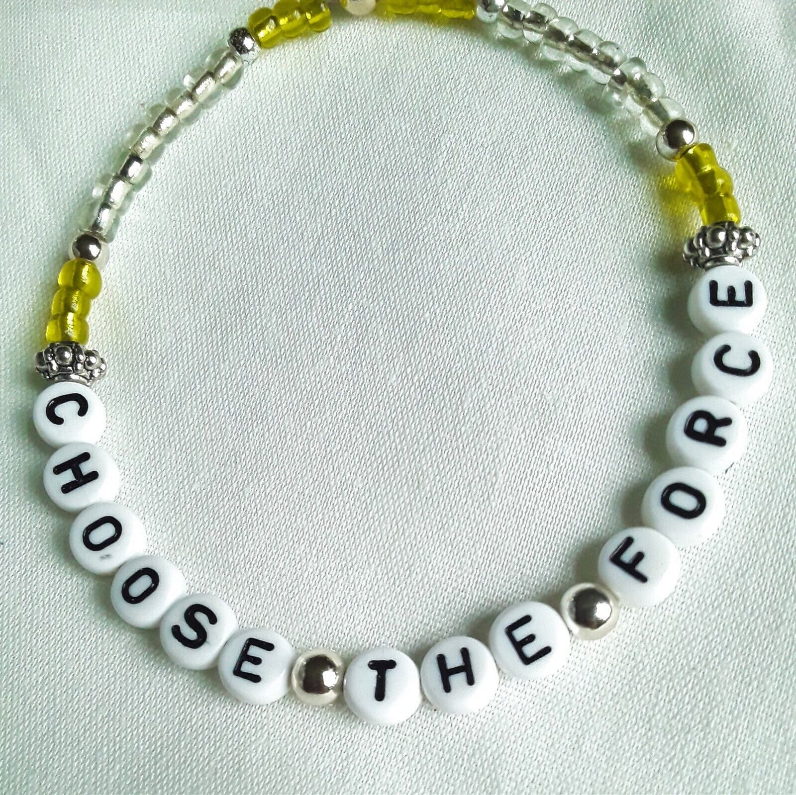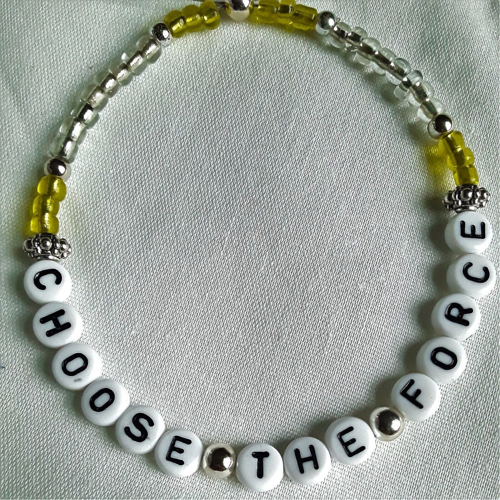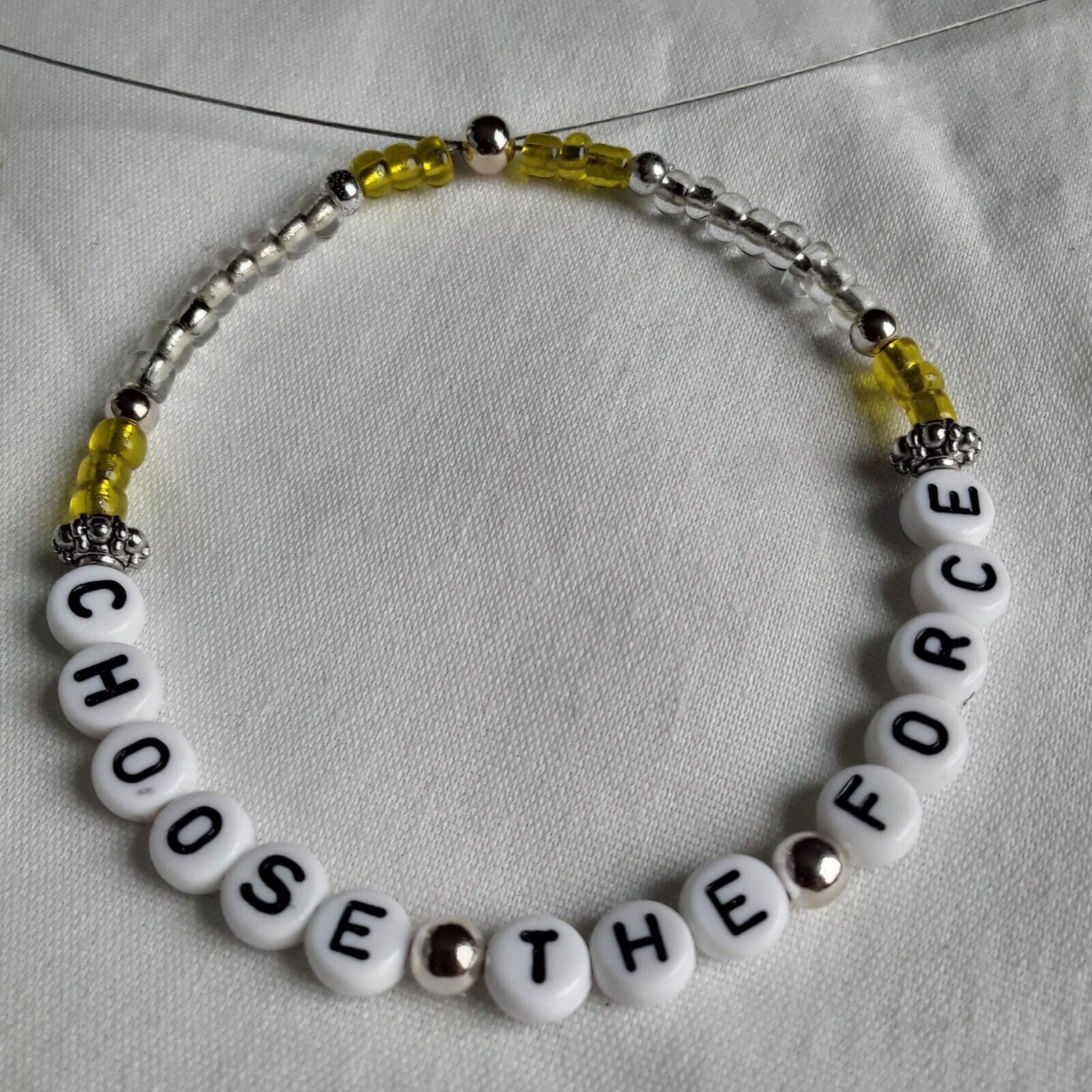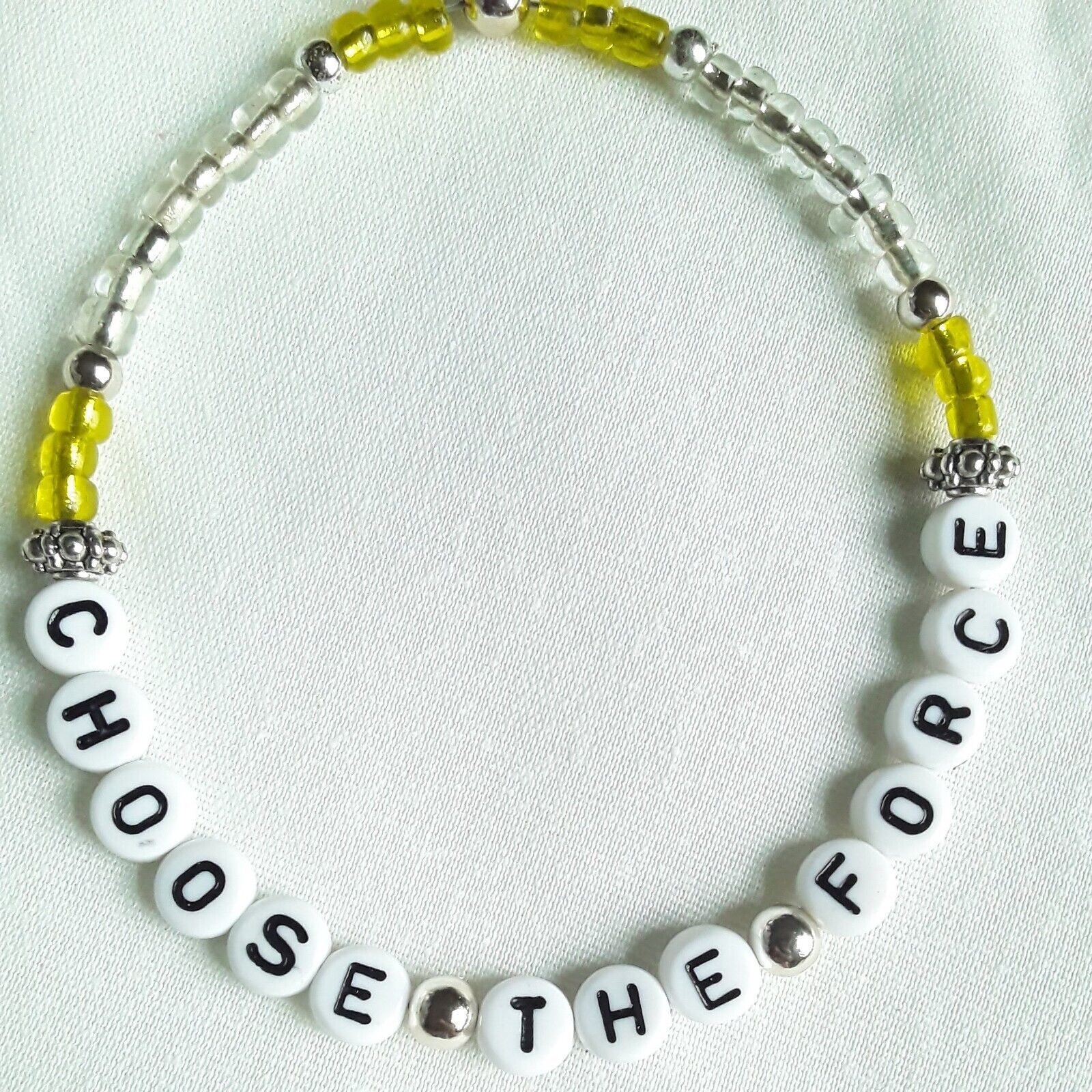 If you know you are one with the force, why not wear it. My Choose the Force Bracelet features acrylic letter beads in black and white and clear and yellow glass beads. Yours will close with a silver-colored lobster clasp and O ring. And Always, always, always, Choose the Force. This bracelet comes standard in 7 1/2 inches, but if you need it longer or shorter just send me a message. NO extra charge for sizing.