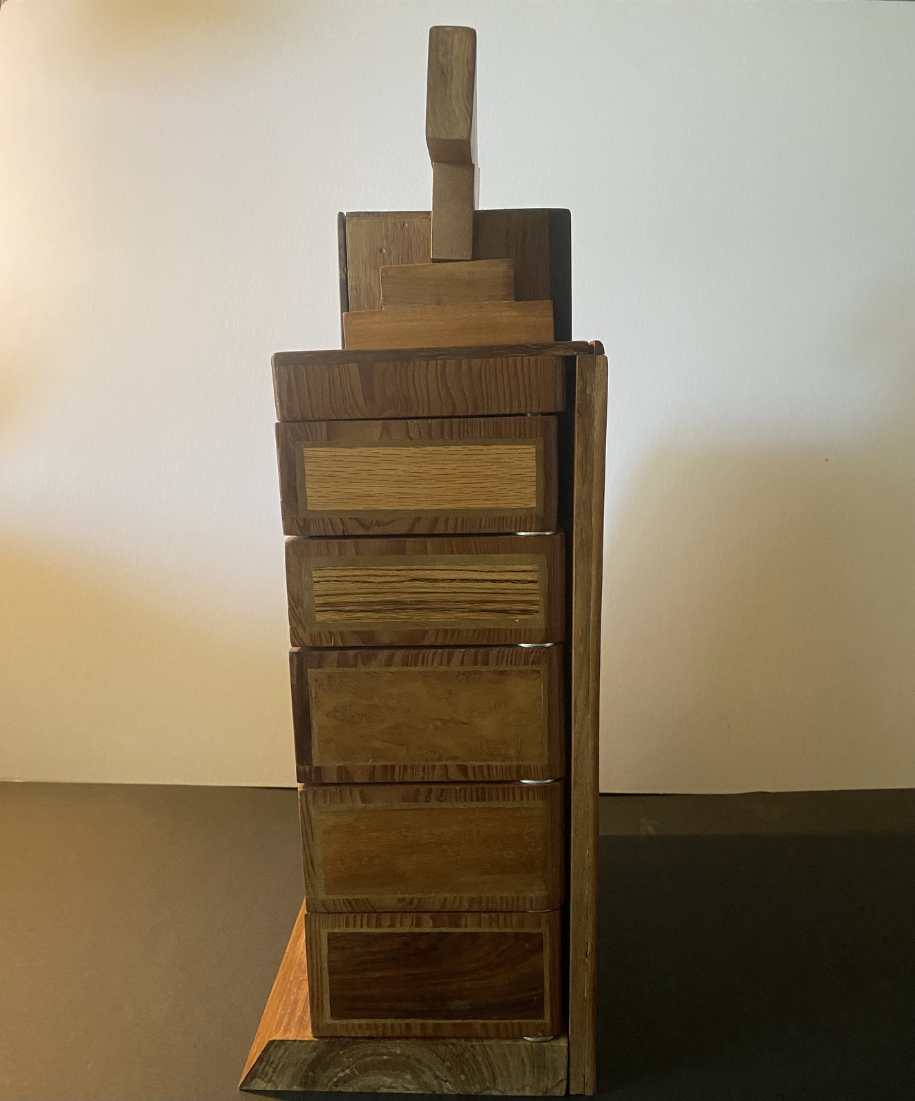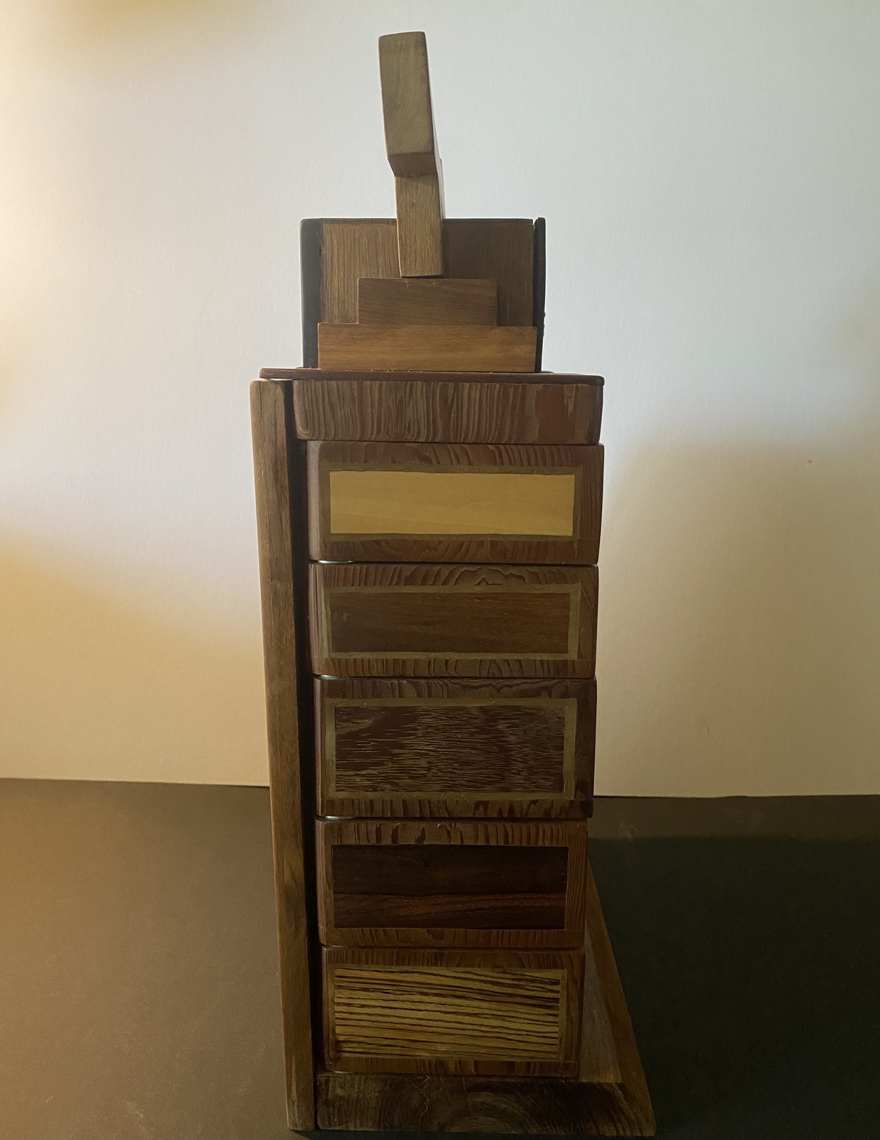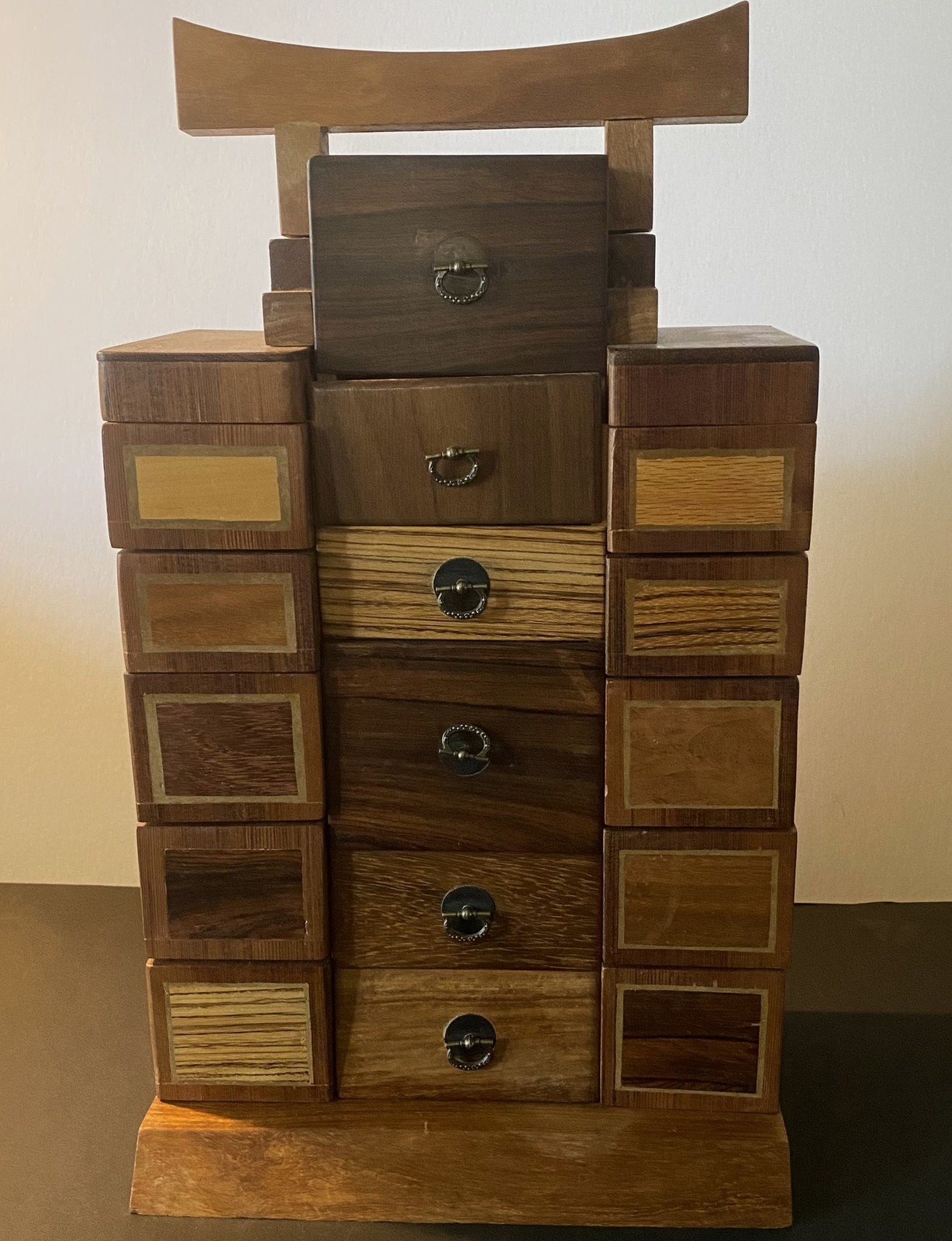 This listing features an antique Japanese keepsake cabinet made from various hard woods and that has ten (10) swing away compartments, five (5) on each left and right side, and six (6) pull out drawers going down the middle, all which store your keepsakes. The entire cabinet is shaped like a Japanese pagoda temple. We're not exactly sure of the age, but our sense is that it's likely quite old and that it is also likely to be a one of a kind piece. We've yet to find anything like this on the Internet. This remarkable piece is as beautiful as it is functional and would work for keeping jewelry or any other treasures.