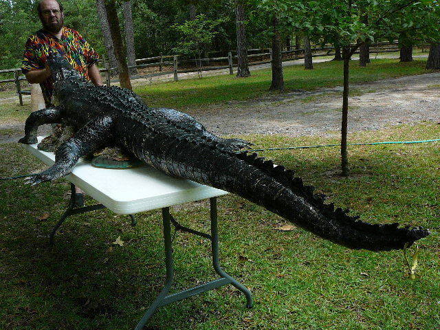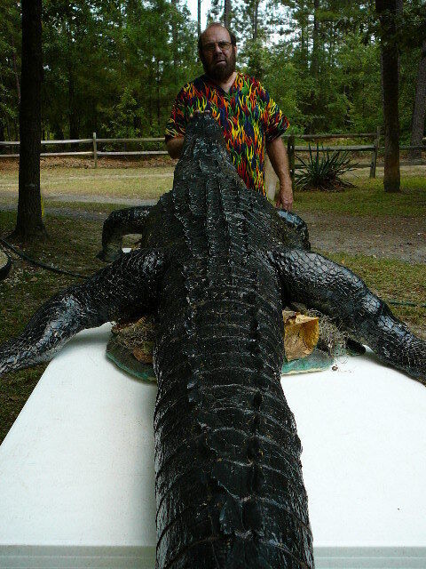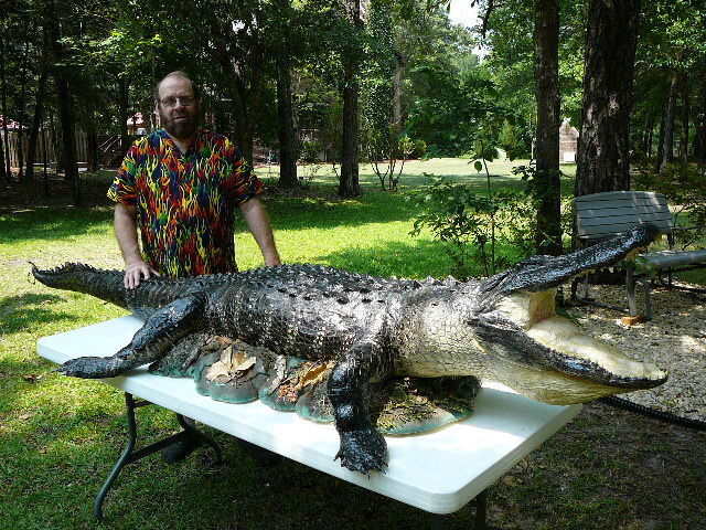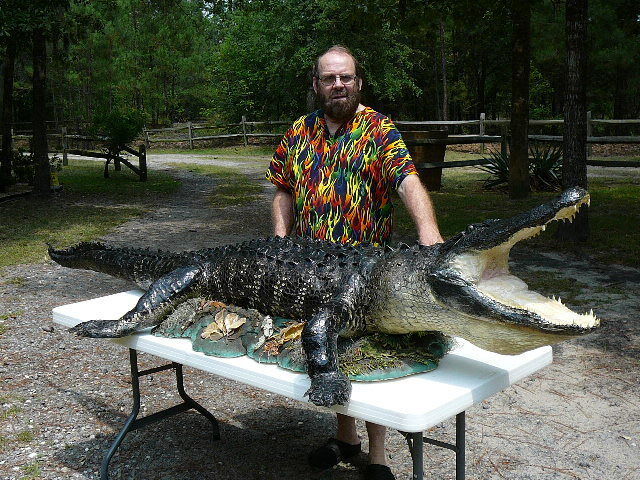 Gator taxidermy of complete skin containing bony scutes, head, teeth, feet all original, in museum quality condition. Gorgeous color and shine. Photographed with Glenn, who is 5'10" tall. This will give you a better idea of the SIZE of this critter.