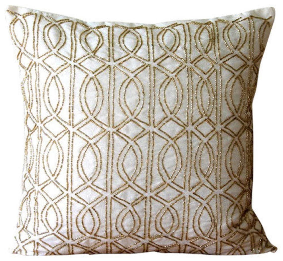 Lattice Trellis Beaded 16x16 Art Silk Ivory Decorative Pillows Cover, Gold Taj
