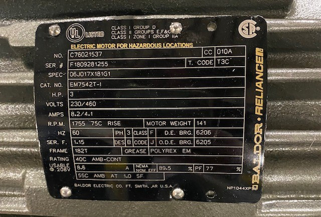 Baldor Reliance EM7542T-I AC Motor, 3HP Frame 182T