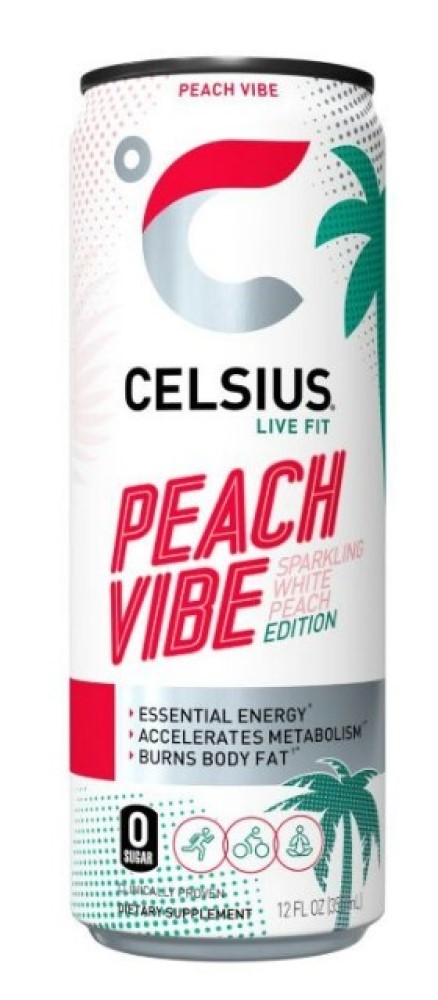 Functional, Essential Energy with 200mg Caffeine to help you LIVE FIT Made with Premium, Proven Ingredients and 7 Essential Vitamins No Sugar, No Sodium No High Fructose Corn Syrup, No Aspartame, No Artificial Flavors or Colors Gluten-Free, Kosher, Non-GMO, Certified Vegan Inspired by the sunny beaches of Miami, there's nothing but good vibes when you open a can of CELSIUS Sparkling Peach Vibe. Savor the vibrant, juicy flavors in every sip.