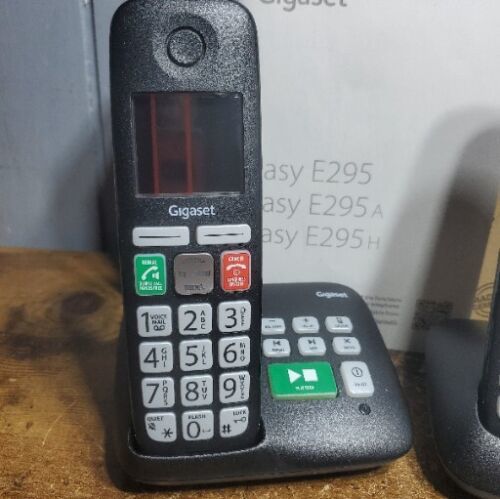 This is the Gigaset E295A Duo, a set of two cordless senior phones made in Germany. The phones have a sleek black color and feature a large 2-inch display for easy viewing. The set comes with all the necessary accessories and is perfect for home use. The brand of the phone is Gigaset and it is of the cordless type. The model number is E295A and it has been manufactured in Germany.