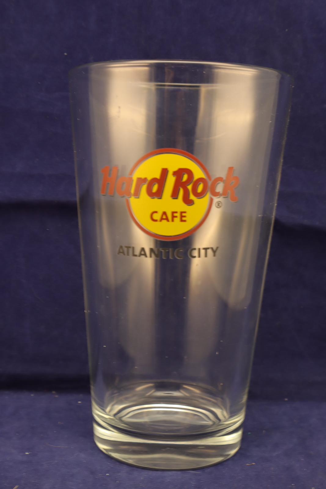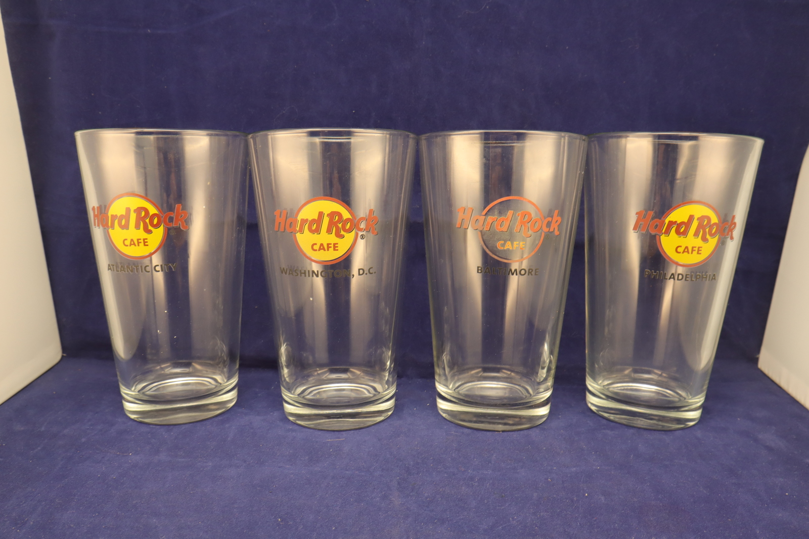 Other Information: These are original souvenir beer glasses from various Hard Rock Cafe locations in the Northeastern U.S. The glasses are from the Hard Rock Cafe locations in Baltimore, MD, Washington, D.C., Atlantic City, NJ, and Philadelphia, PA. You will receive all four glasses pictured.