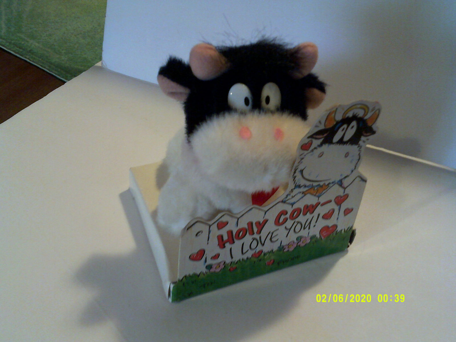 **SORRY PHOTOS SHOW INCORRECT DATE** Rare, Unused Cow plush Animal attached on Company board pack from 1993. The board front reads "HOLY COW - I LOVE YOU". The cute Cow plush is white and black colors with red Ribbon round neck and Company marked Tuch Tag. Very Adorable indeed to add to your Collection.