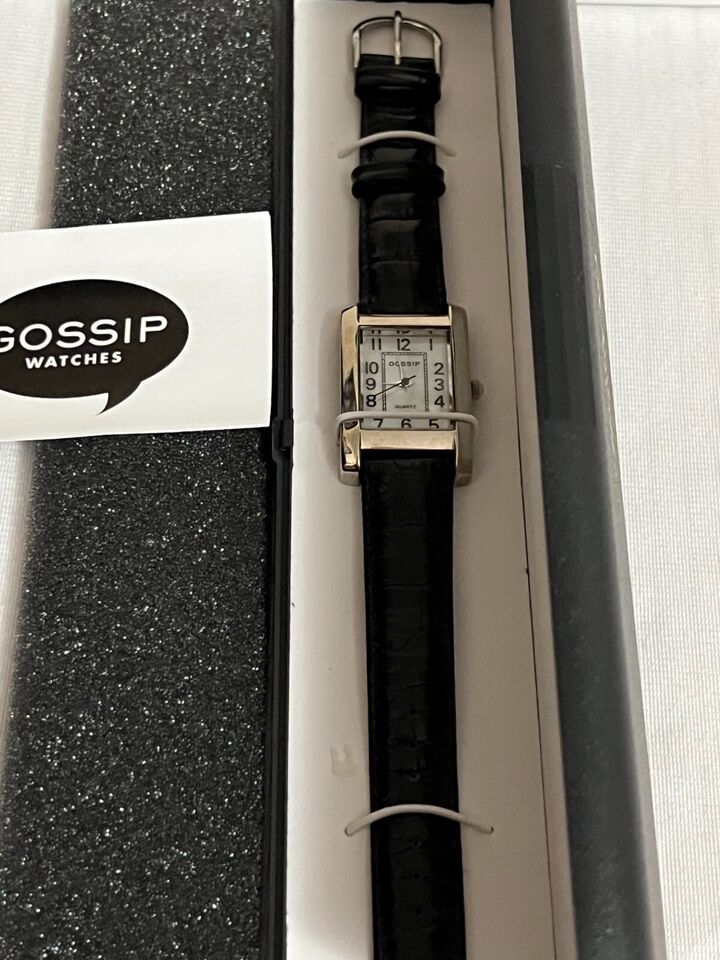 This Gossip women's wristwatch boasts a stylish silver-tone bezel and a chic black leather band. The rectangular face of the watch features a classic white dial with easy-to-read hour markers. This watch is brand new, comes with the original box and packaging, and does not come with papers or service records. The watch has a seller warranty and features a 12-hour analog display.