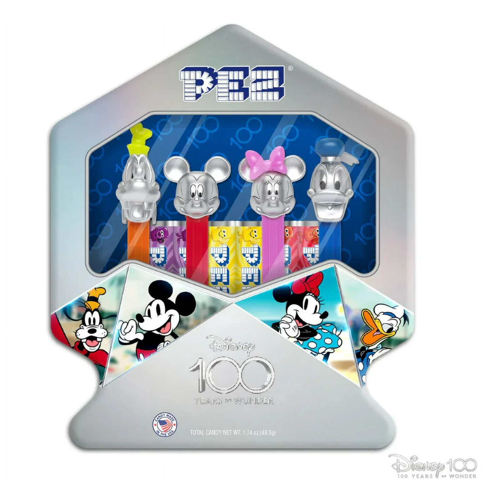 Disney 100 Gift Tin - Celebrating 100 years of Disney this D100 PEZ Gift Tin features our favorite Disney Mickey and Friend's PEZ Dispensers in a platinum finish!