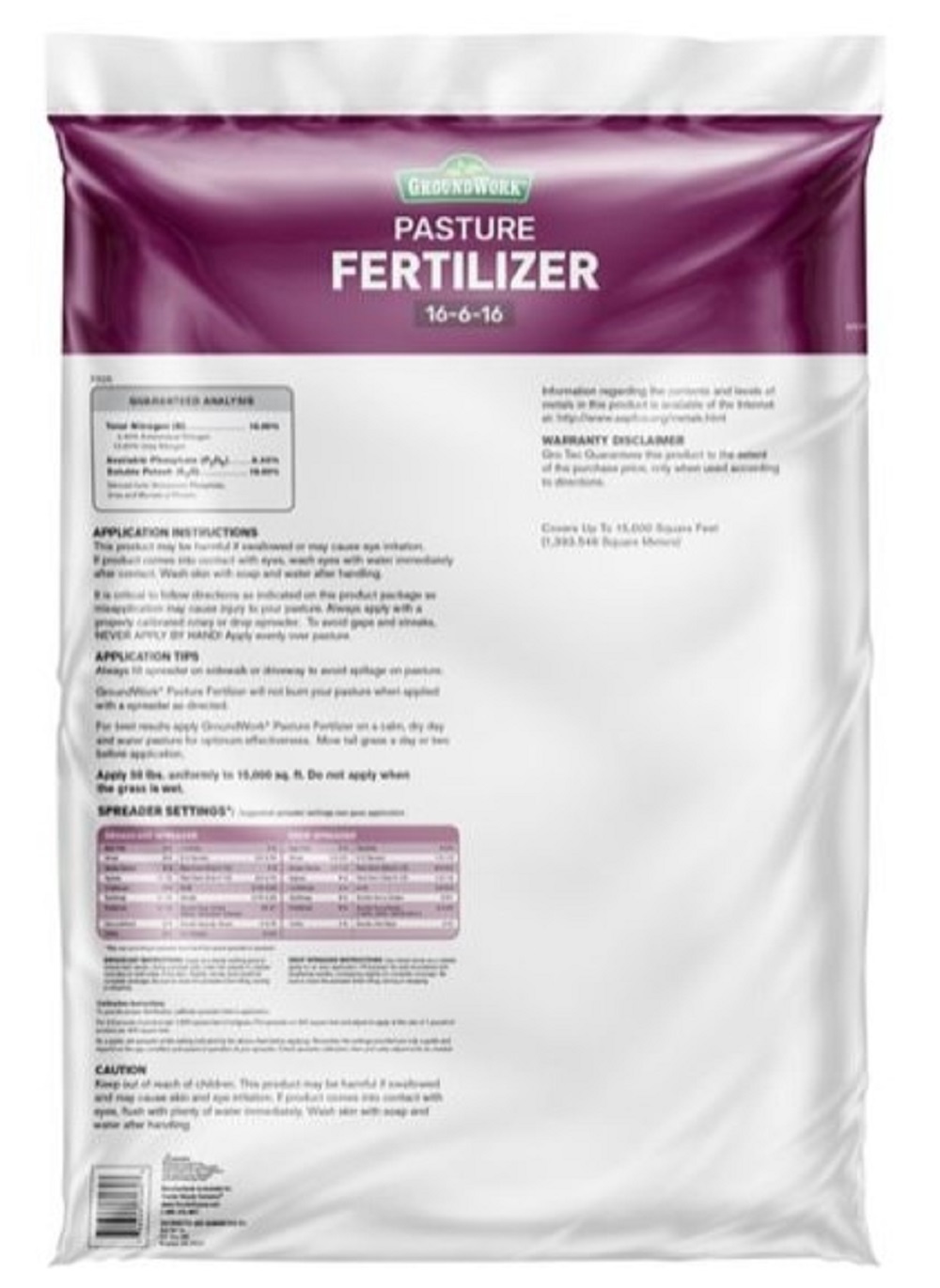 Pasture fertilizer promotes dense forage for improved grazing Grows quicker, greener forage for heavy traffic areas Formulated with primary nutrients for all pastures and meadows For best results, apply your Groundwork fertilizer on a calm, dry day and water-in Apply evenly over pasture Allow for rainfall before returning animals to pasture 50 lb. bag covers up to 15,000 sq. ft. of total pasture