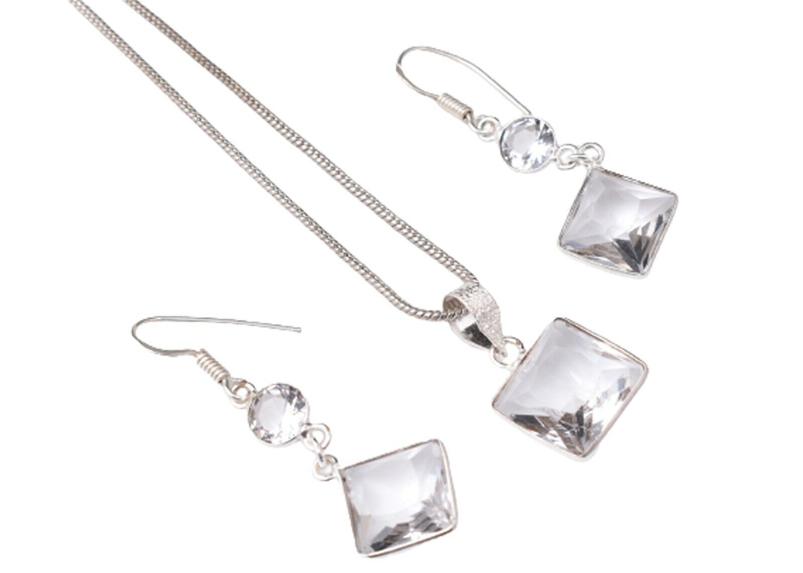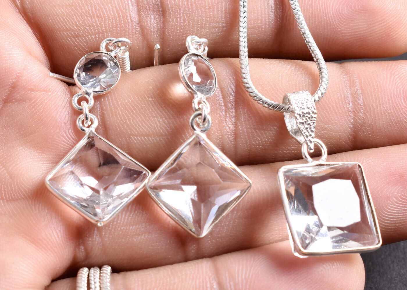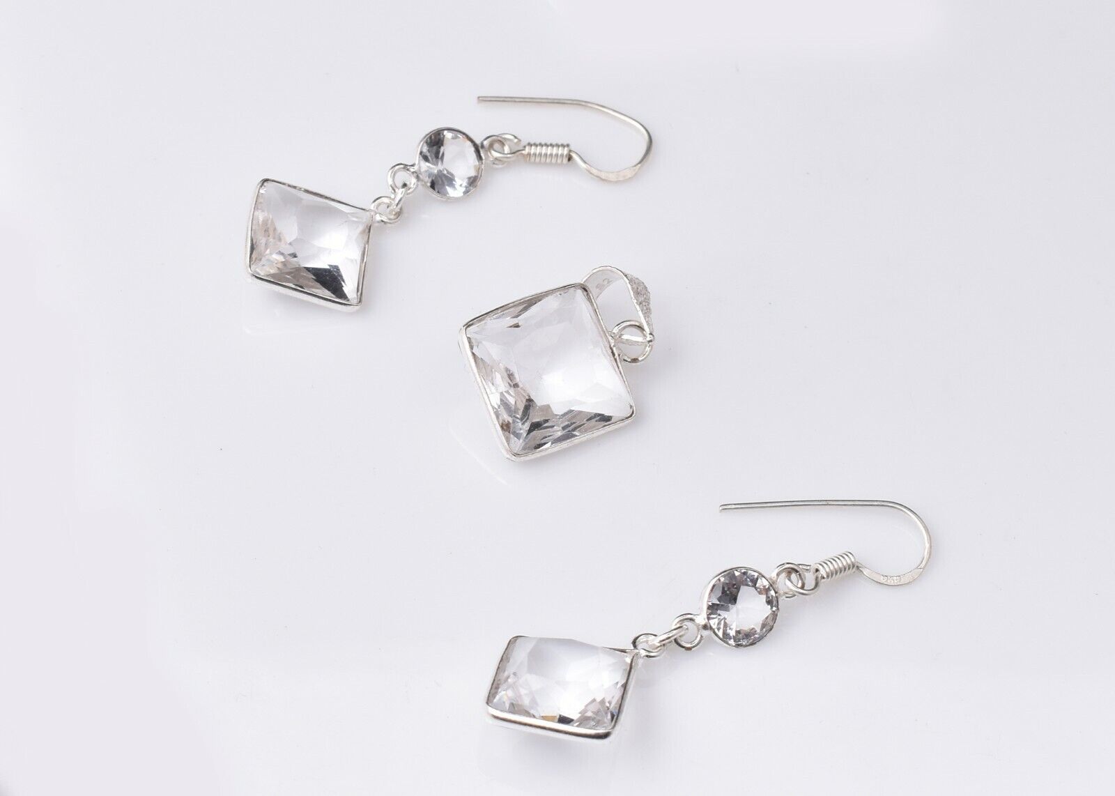 Sterling Silver White Topaz Gemstone Handmade Pendant Earrings Women Party Wear