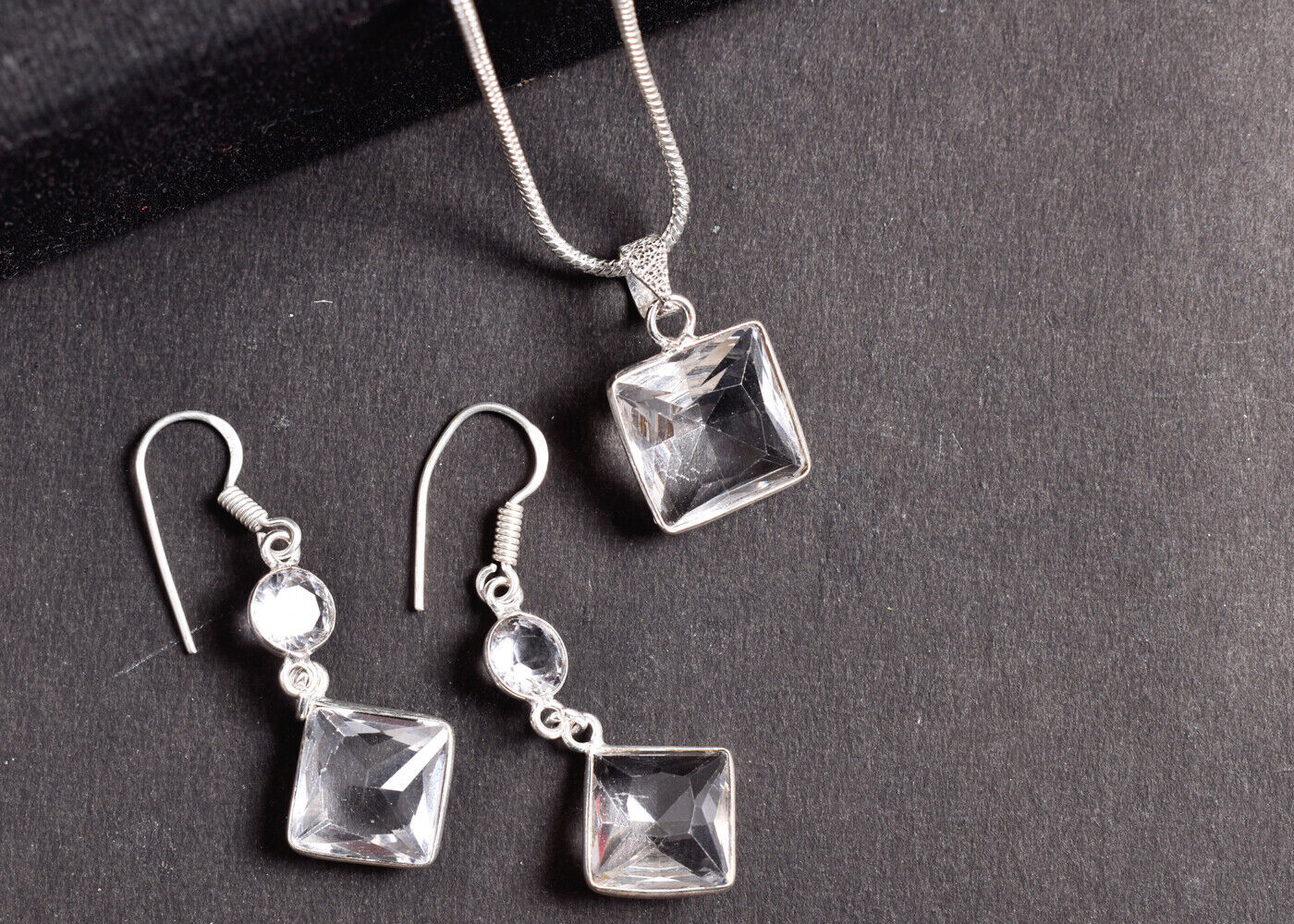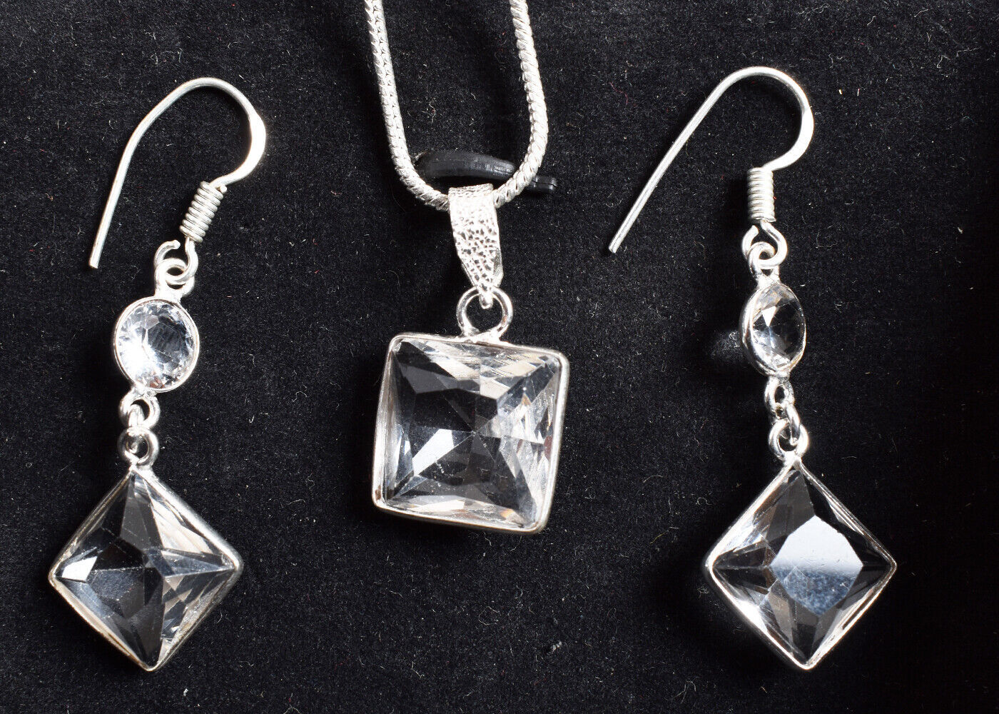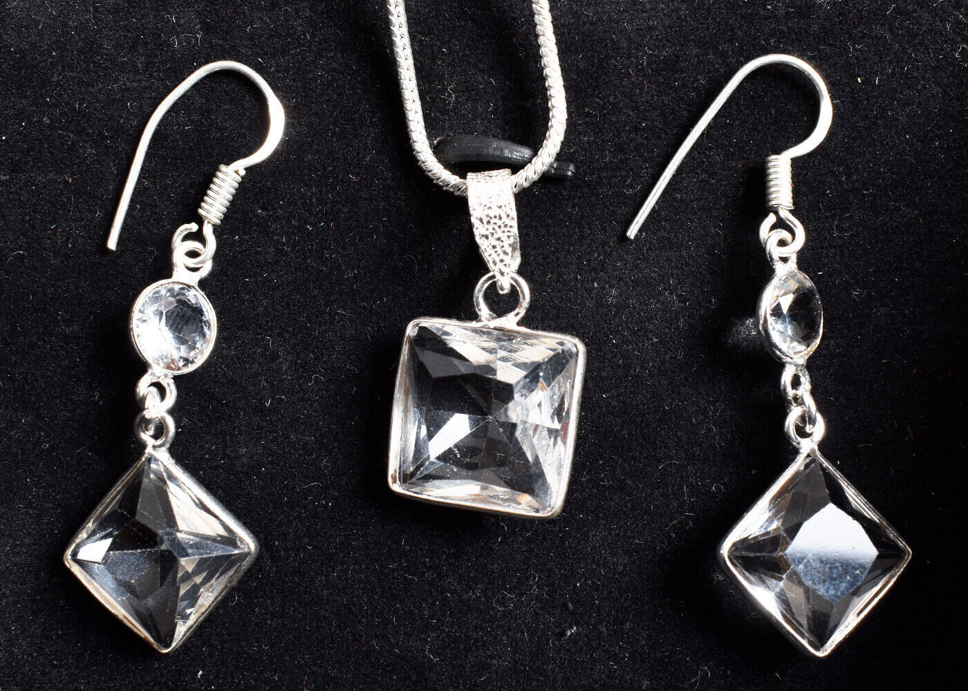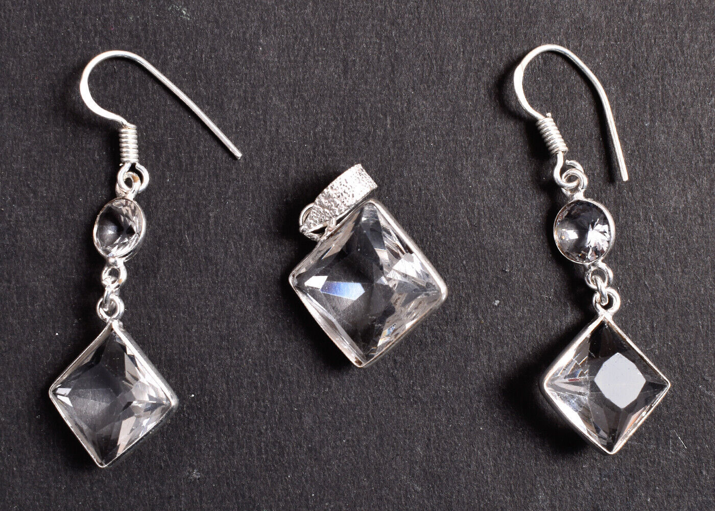 Sterling Silver White Topaz Gemstone Handmade Pendant Earrings Women Party Wear