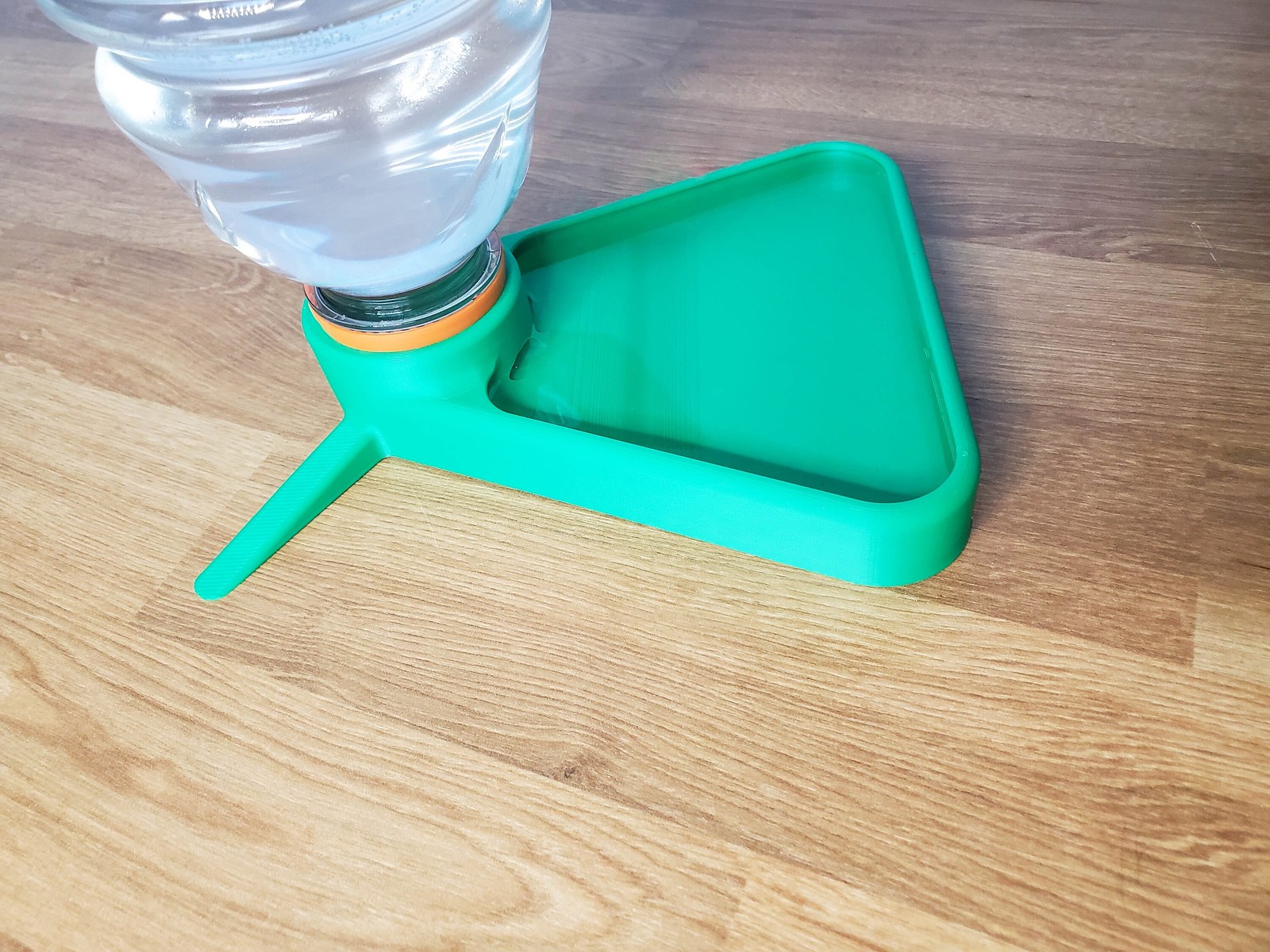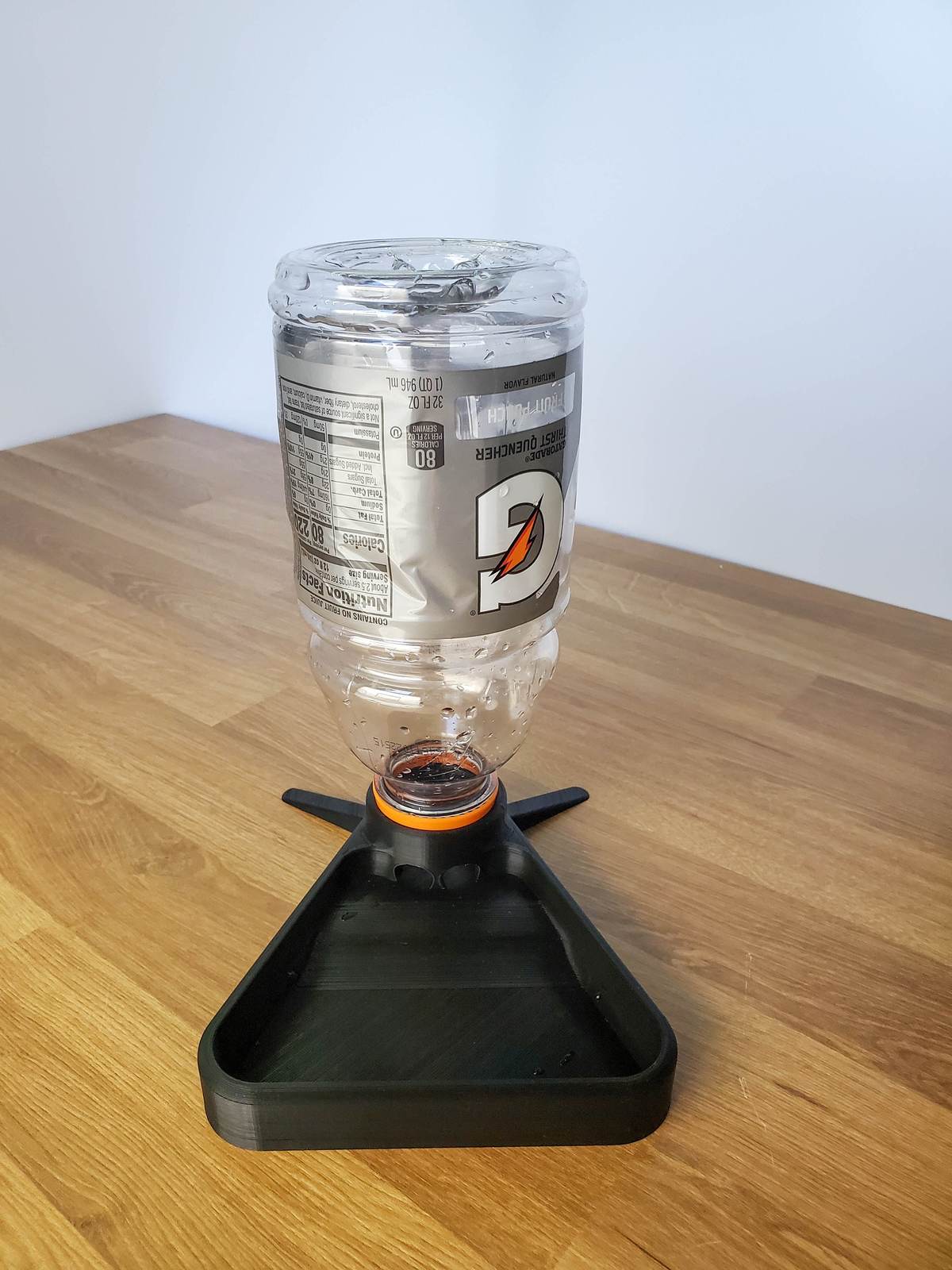 This sturdy automatic watering dish can use any standard 32oz or 64oz Gatorade bottle. The reservoir will self fill until it reaches a point well below the top splash guard. They come in any color and all are made from a durable, safe, and plant based PLA plastic. This water dish was tested on animals but none were harmed. The Gatorade bottles are not included and its not dishwasher safe. This was designed by Scott Correia from Silver Spring MD.