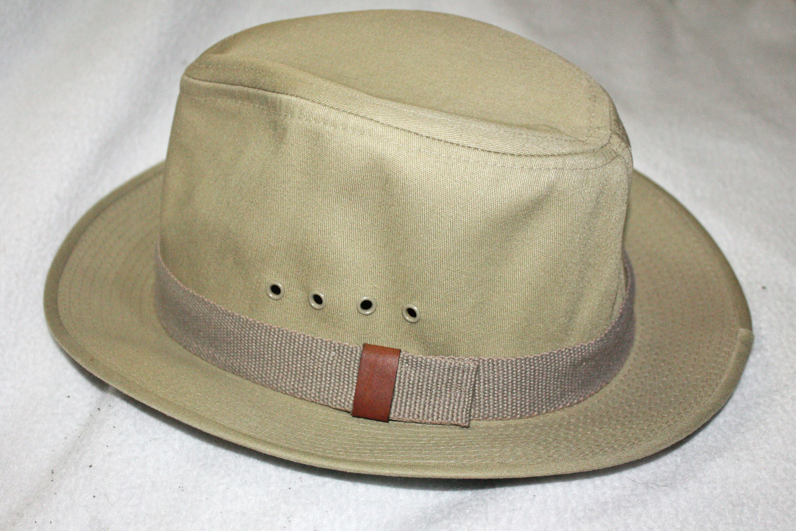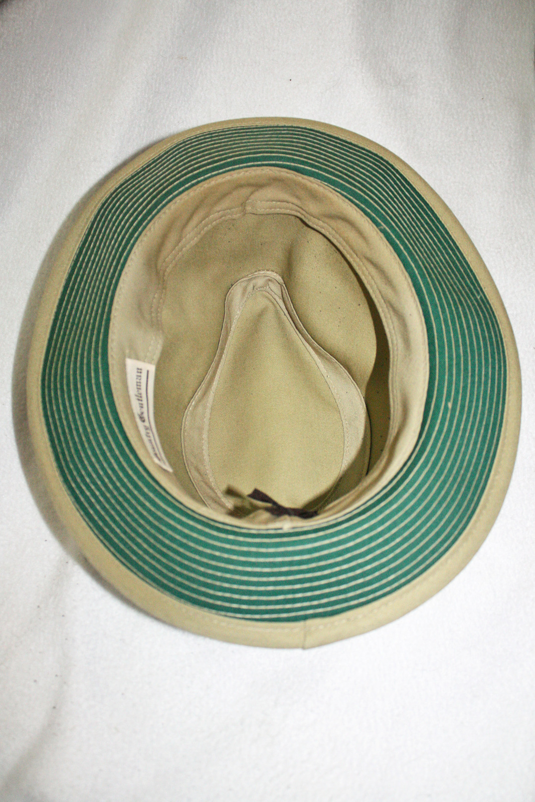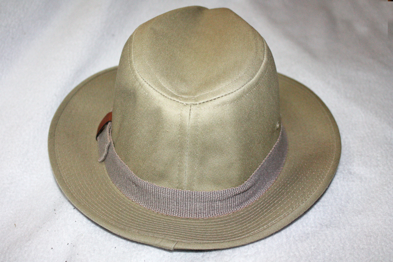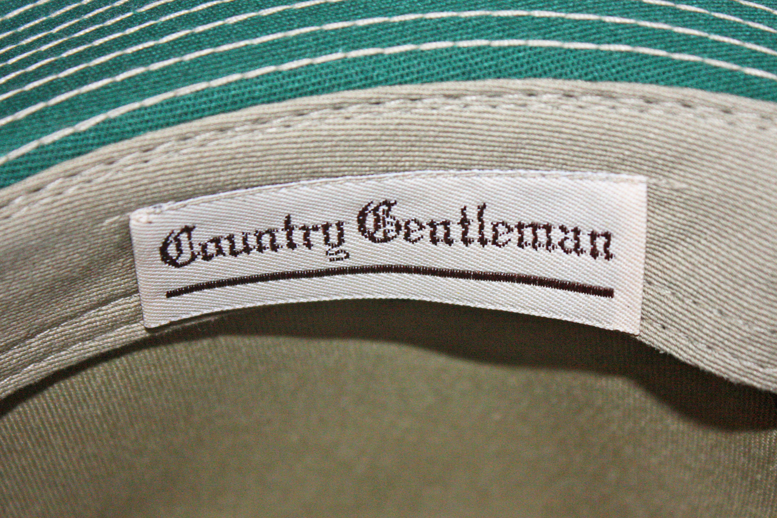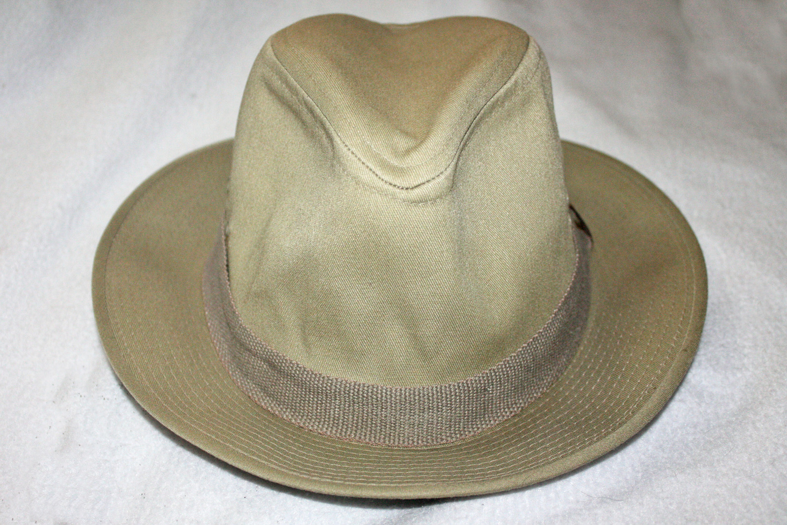 This is a men's Country Gentleman Fedora hat that is in excellent condition. It is size large with an inner circumference of 22.5". It is a canvas type material but no material tag to confirm. It is a light khaki green color.