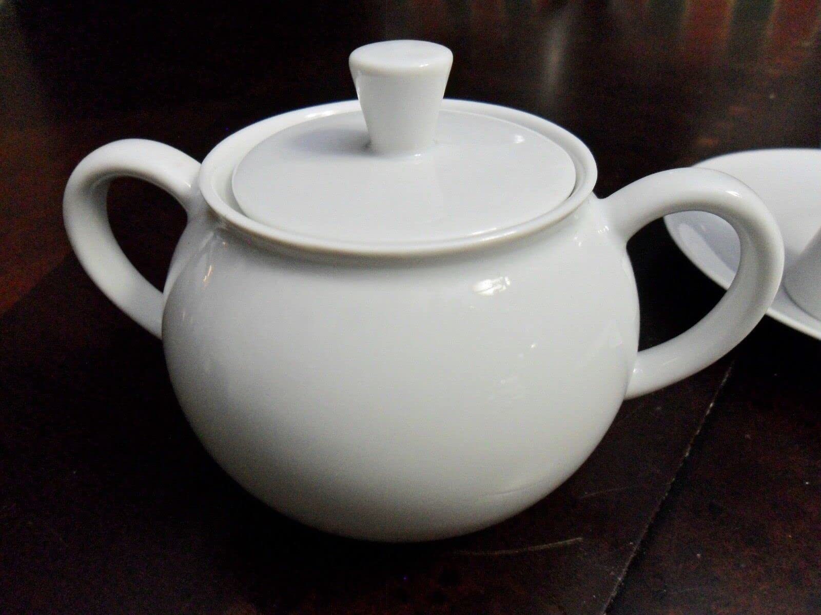 ArzFits Berg Germany White pair of Double Egg Cup with Saucer and covered sugar, cups are 31/2" x 3" and saucer is 6", covered sugar is 4" x 5 1/4" handle to handle 86bsktrack6