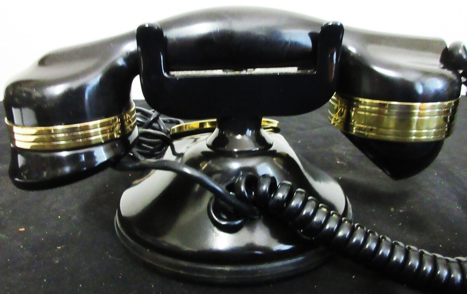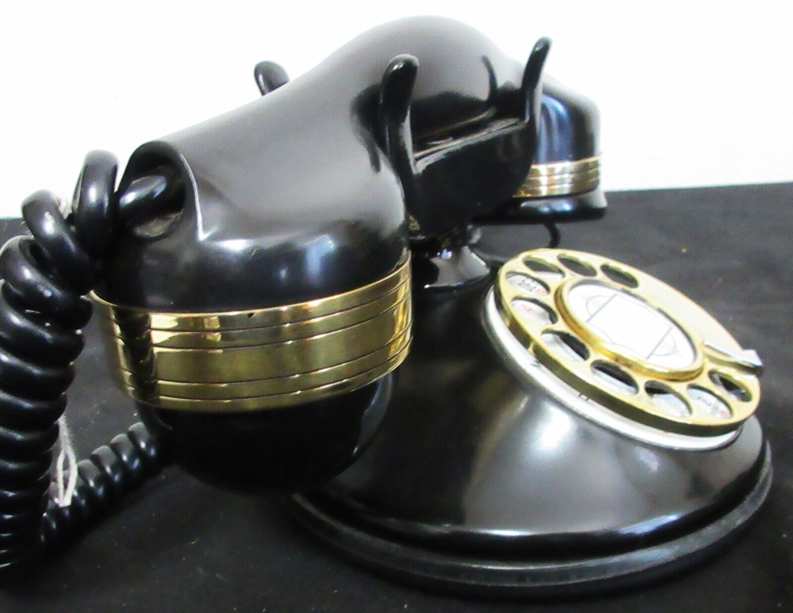 The table phone has a brass dial and bands on the handset