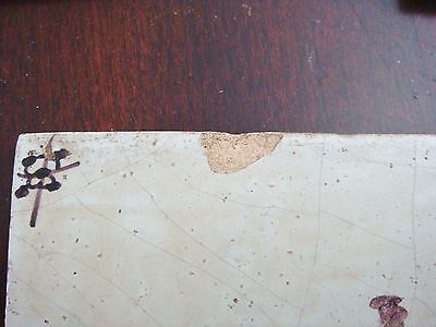 18th century salvaged Delft manganese tile with depictions of buildings and seashore, 5" x 5", some surface scratches, fleabites rough borders and light chips, look at the pictures they are part of the description