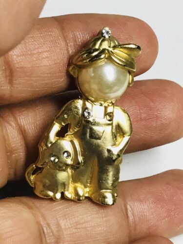 Boy with Dog Pin Brooch Gold-tone with Faux and similar items