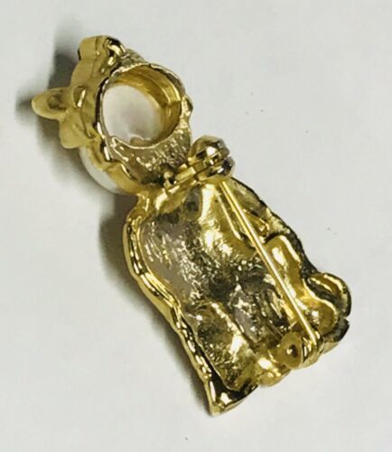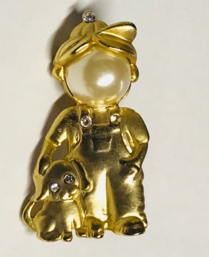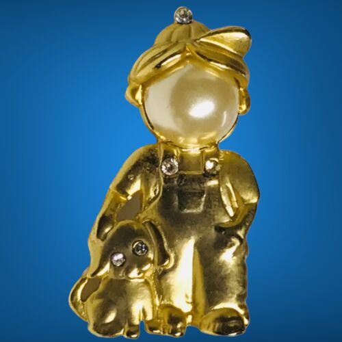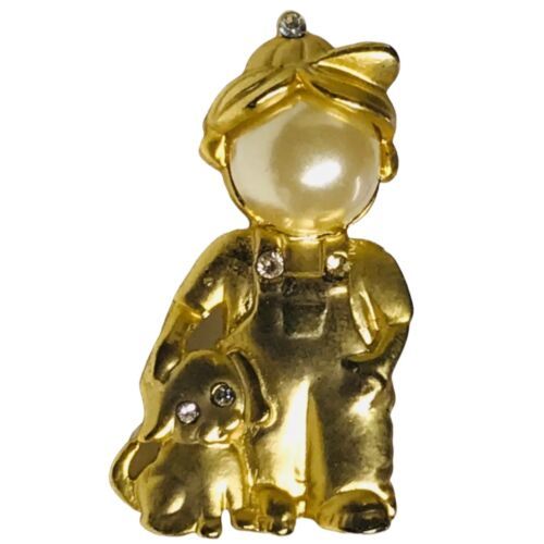 Boy with Dog Pin Brooch Gold-tone with Faux Pearl Head