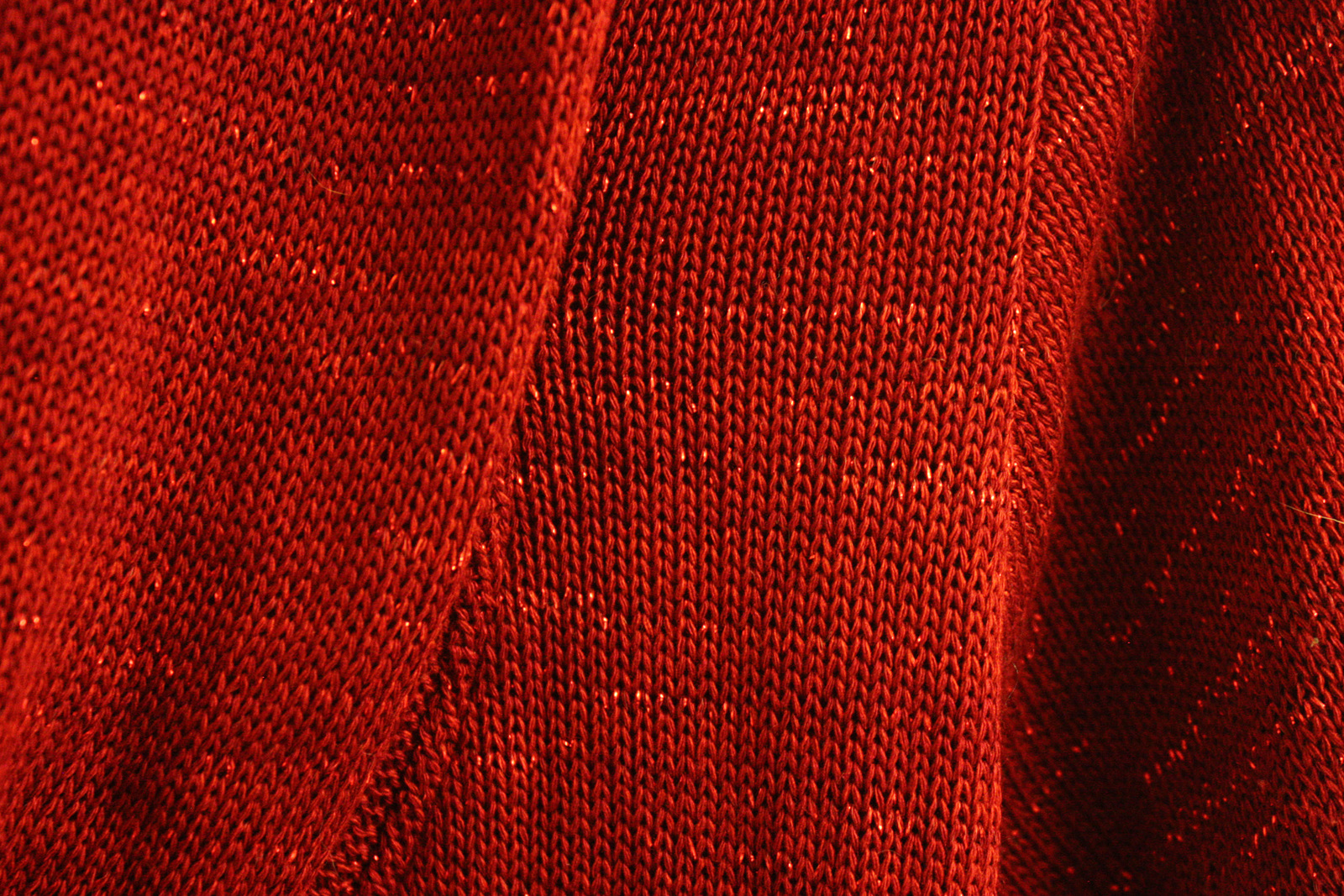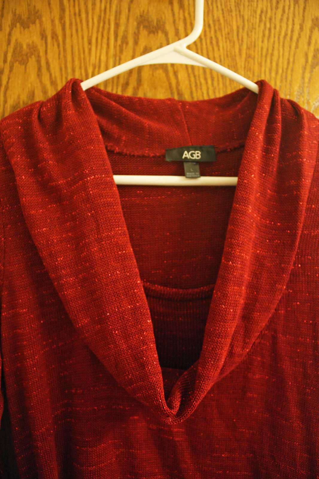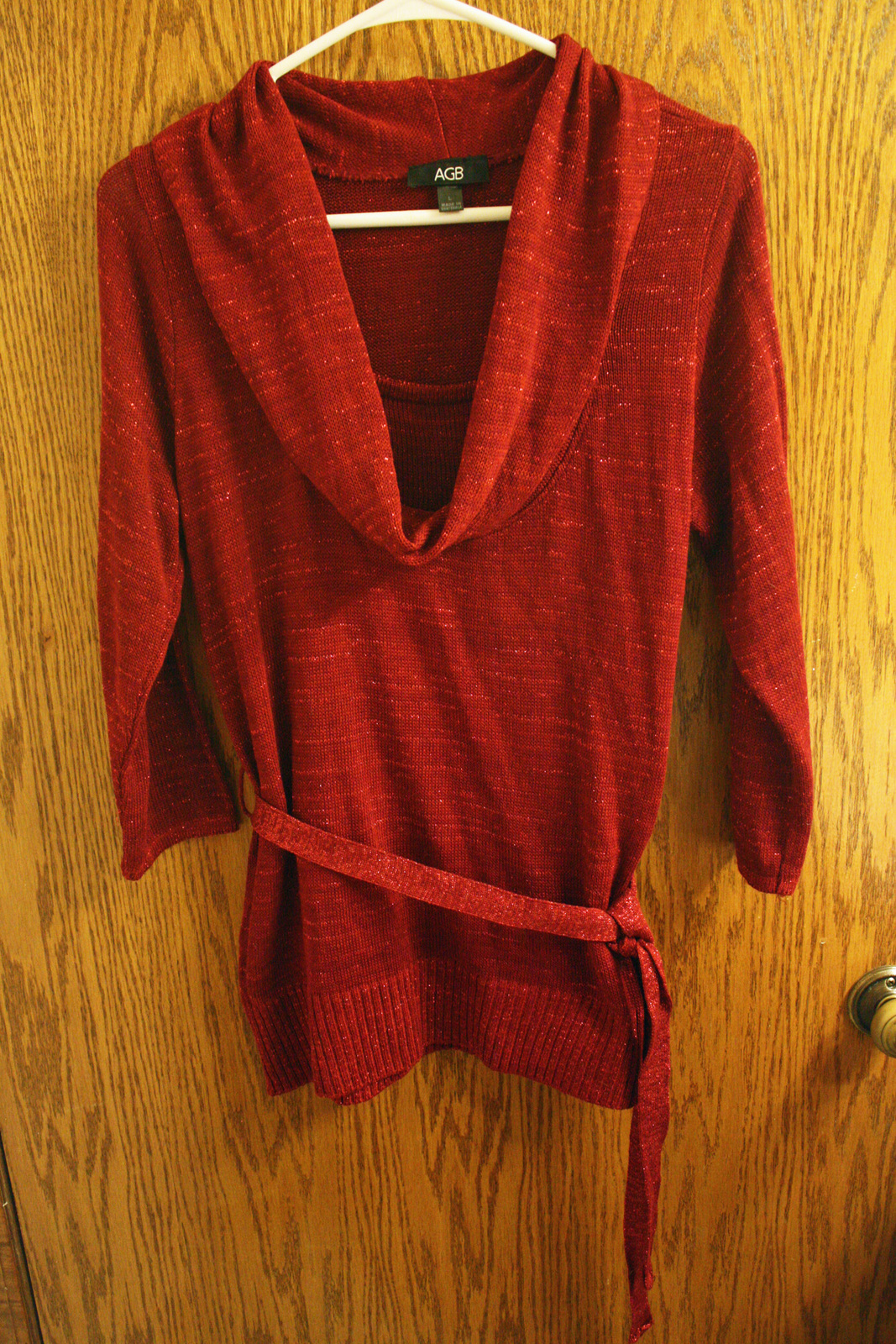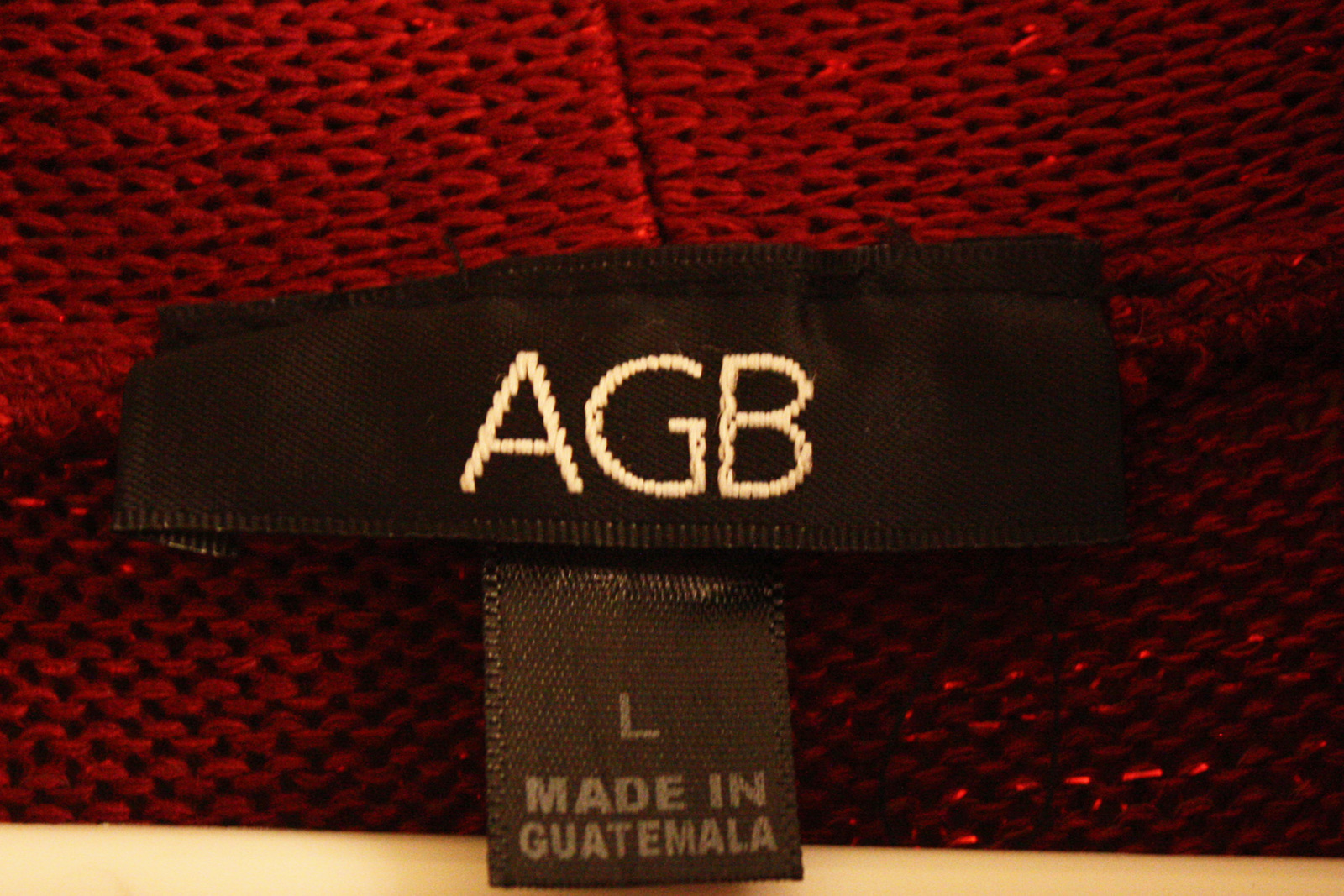 This is an AGB red sweater that is in excellent condition. It is red and sparkly all over the sweater. The size is large. The material is 90% acrylic, 5% spandex, and 5% metallic. It has a cowl neck with an attached band to cover the chest but is not a bra. The sleeves are 3/4 length. It is a small tight knit sweater with a ribbed band along the bottom hem. It has a 1" wide attached belt at the waist which ties closed, not buckled. There are no stains or rips in the fabric.