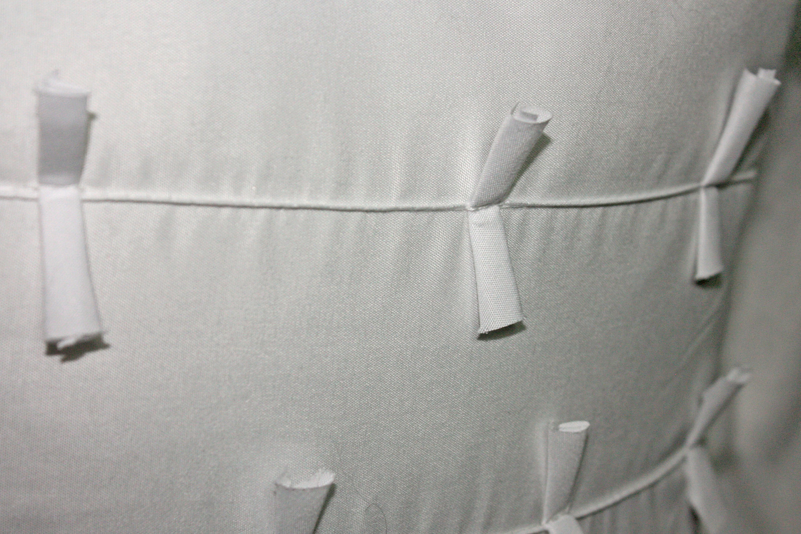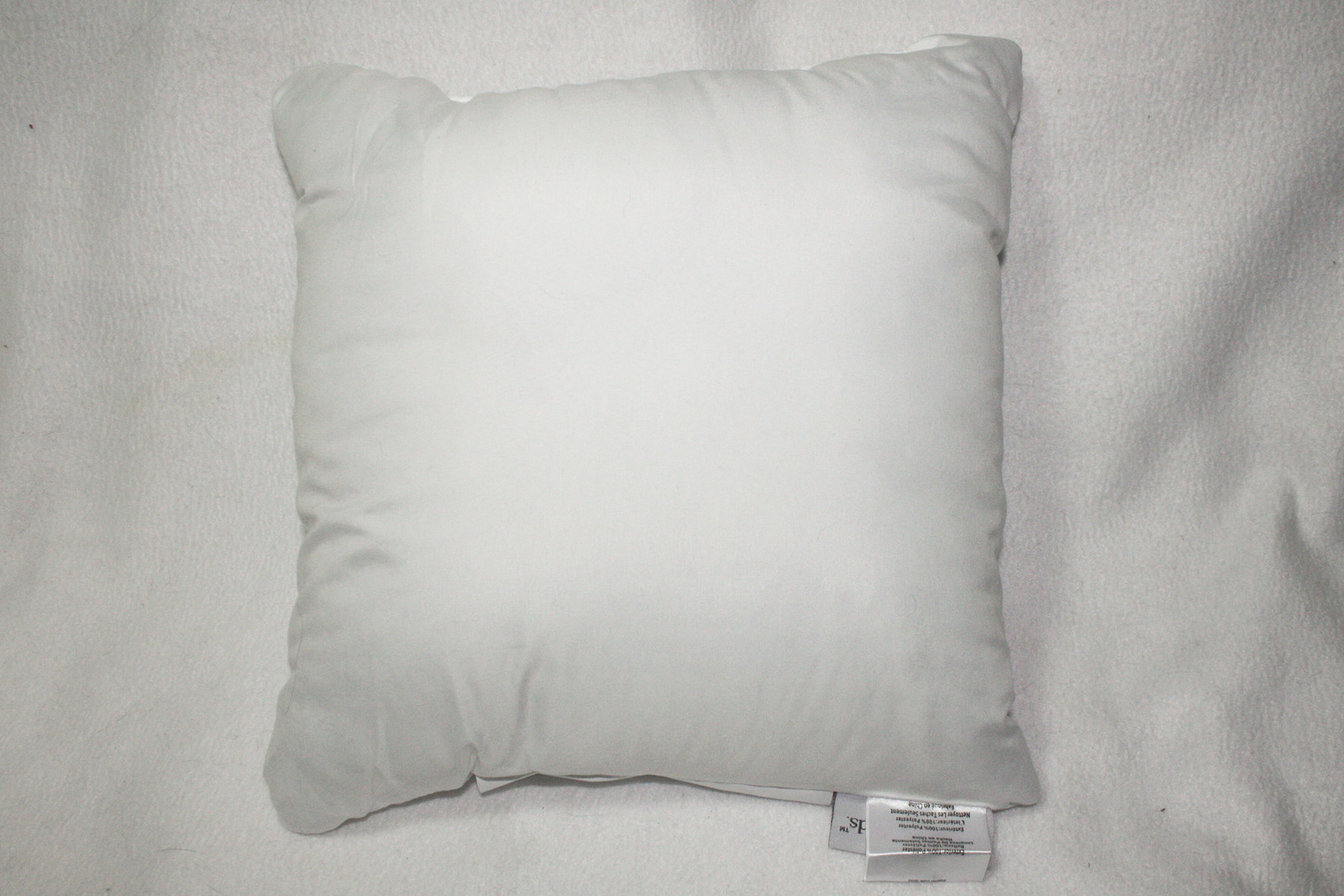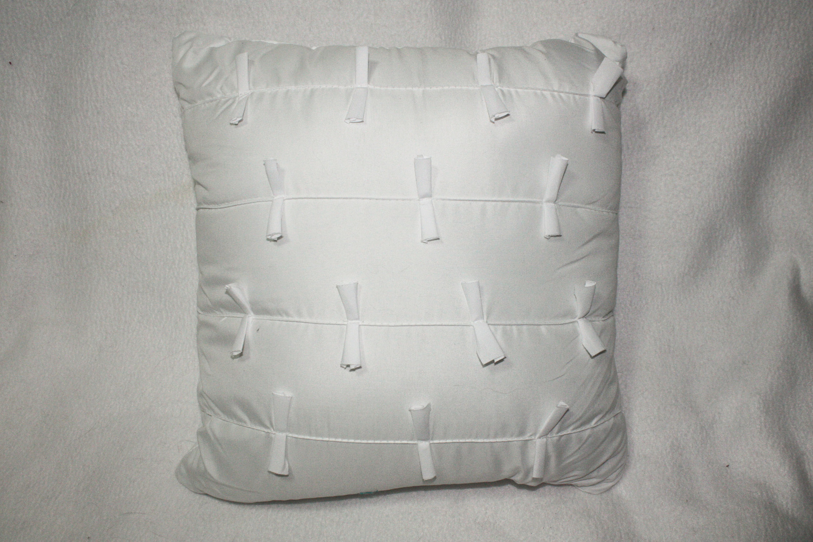 The pillow is a 14" x 14" square pillow. It is solid white. The material is 100% polyester inside and out. The front has stitched on little pieces of fabric in rows to give a textured 3D detail to it. No stains or rips in the pillow.