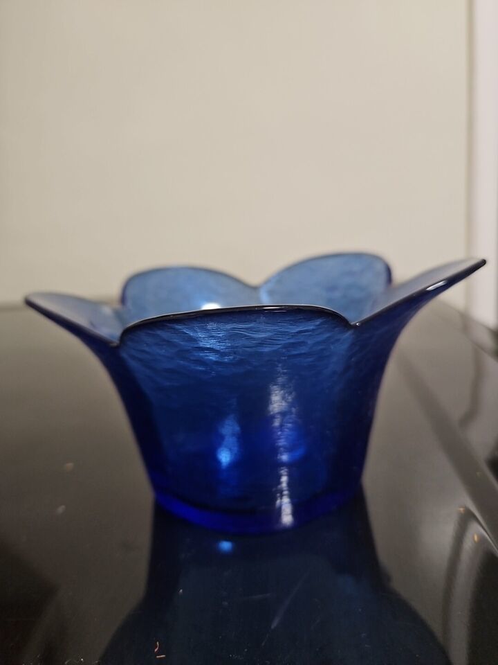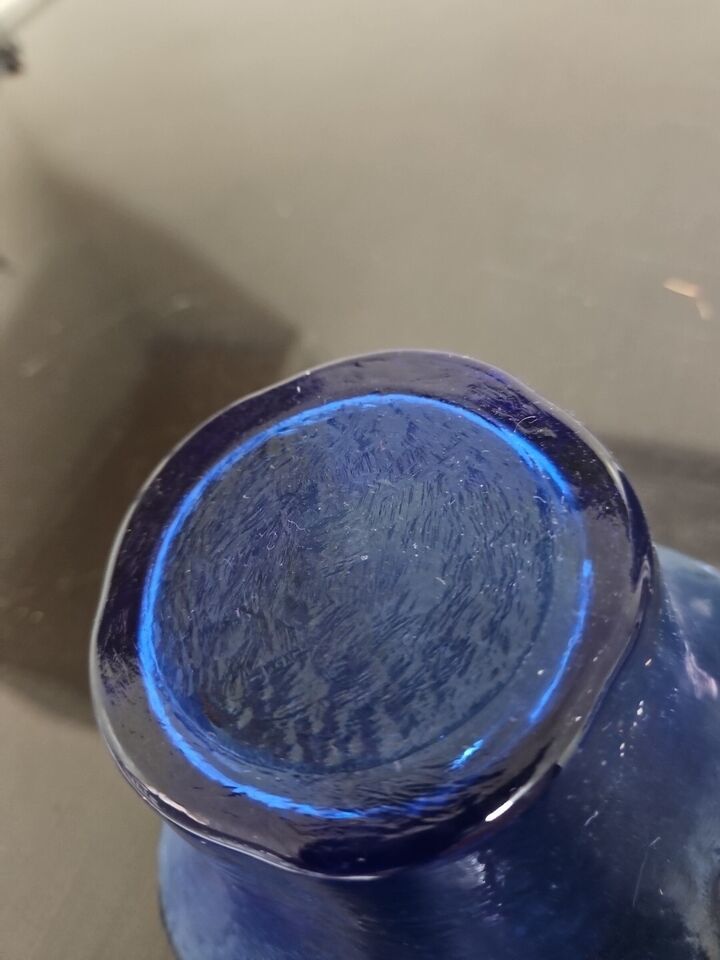 Add a touch of vintage charm to your home decor with this stunning cobalt blue glass vase. Measuring 3 inches in height, this vase features a ruffled edge design and is hand blown with a glossy finish. The vase is perfect for displaying your favorite flowers and will make a great addition to any collection.
