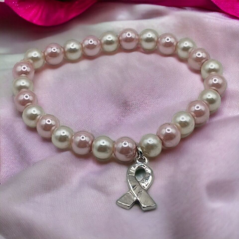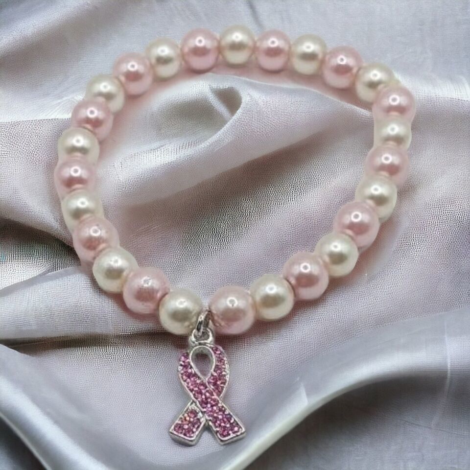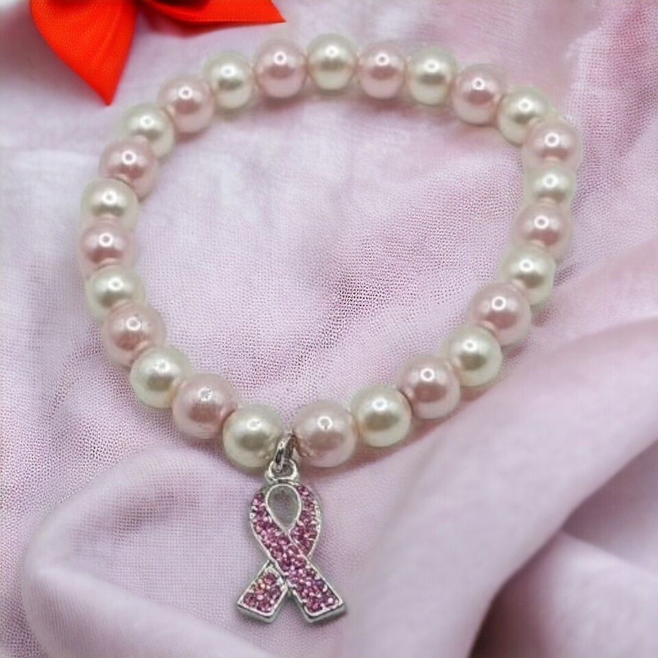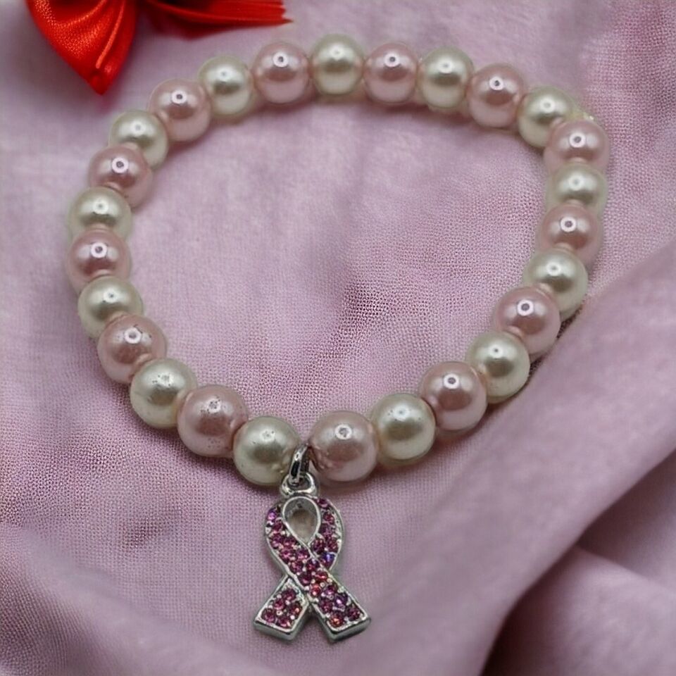 Breast Cancer Awareness glass pearl stretch bracelet. Condition is Pre-owned. Shipped with USPS Ground Advantage.