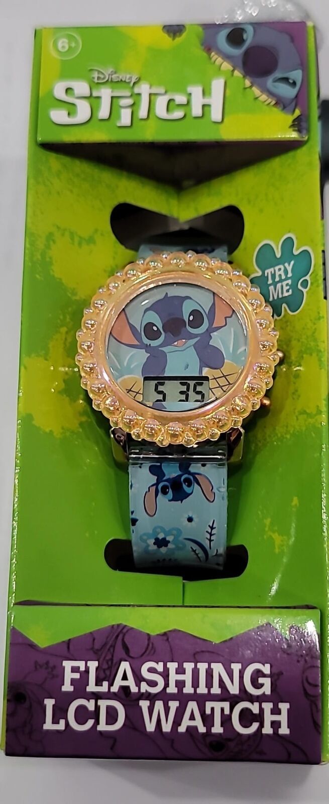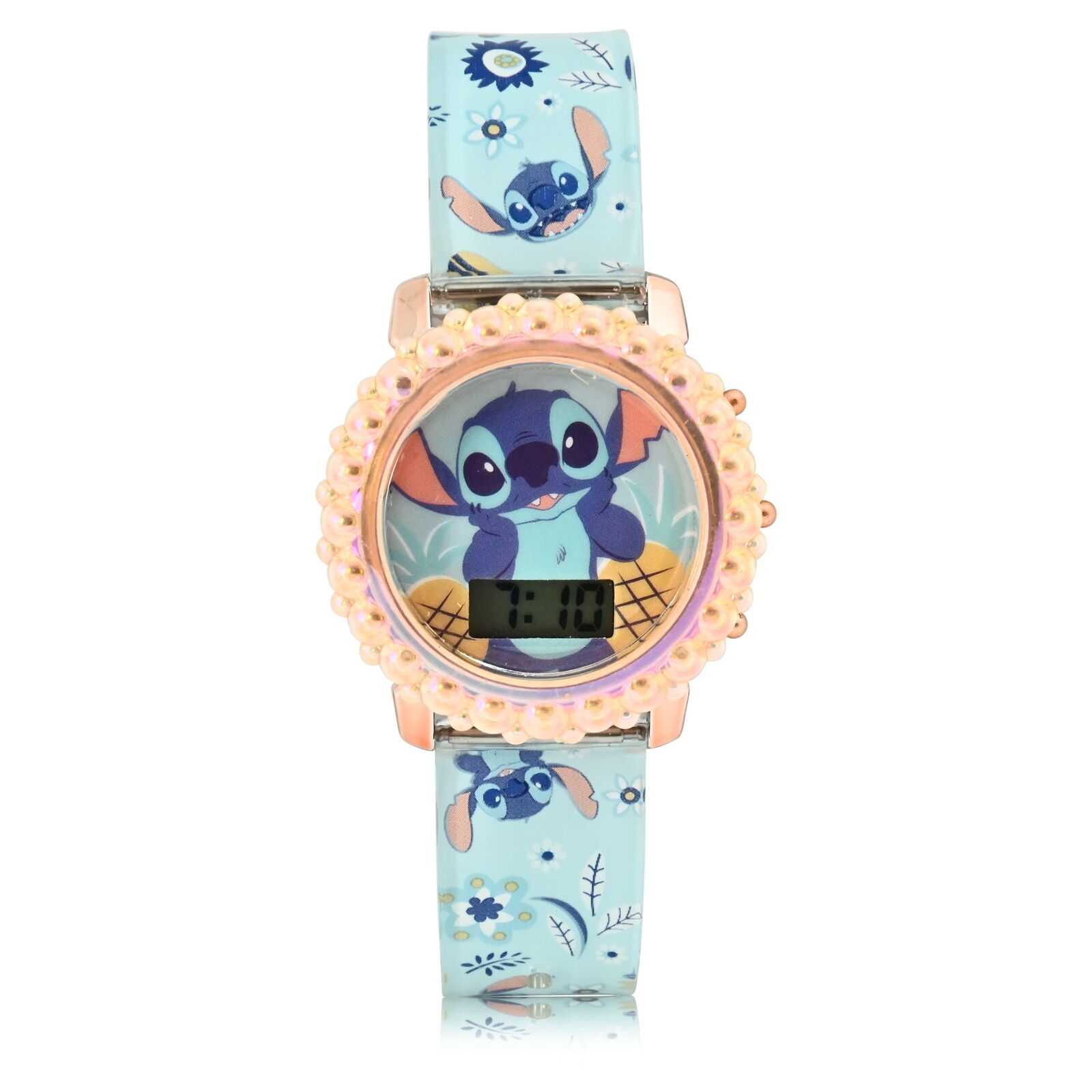 Stitch flashing lights LCD watch. Molded peach metallic plastic bezel. Printed art dial with multi-colored flashing lights. Printed Stitch art on plastic strap.