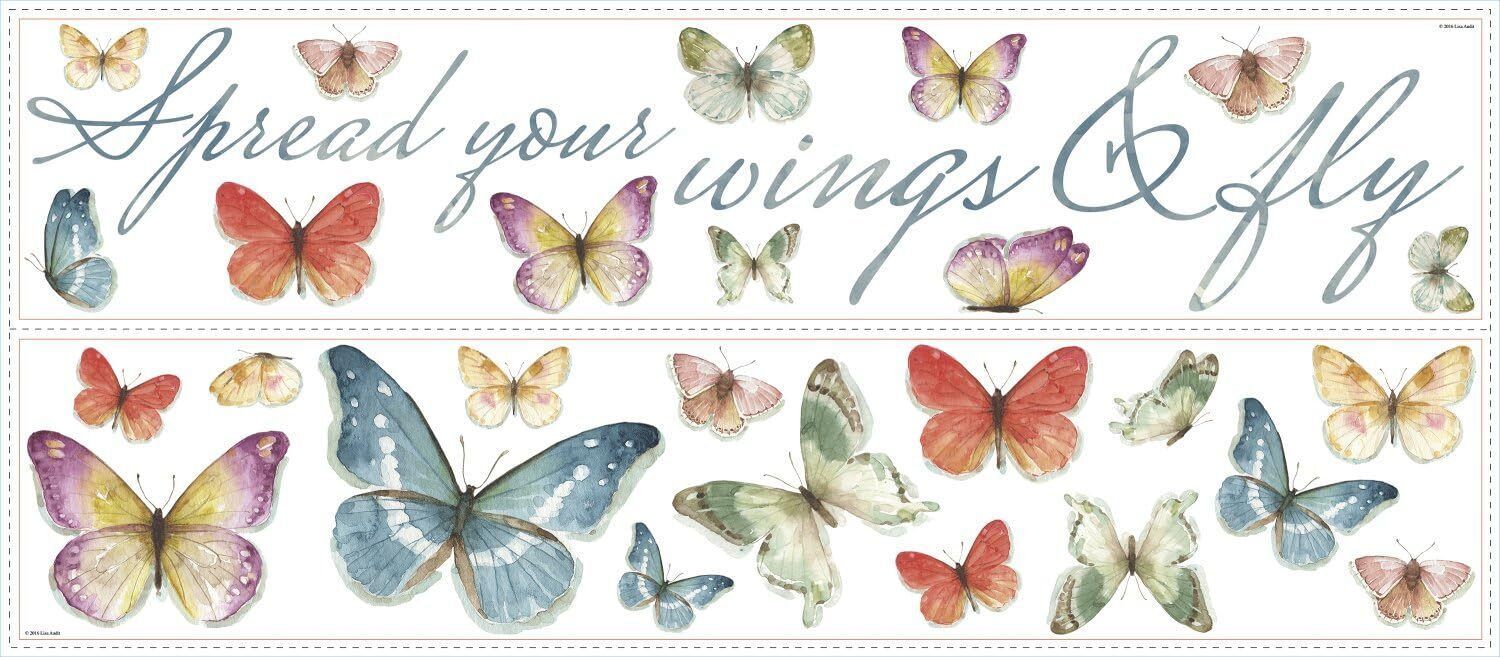 Enchanted butterflies and meaningful quotes come together to create charming room decor with Lisa Audit Butterfly Quote Wall Decals by RoomMates Decor. Designed with the quote ?Spread Your Wings and Fly? surrounded by colorful butterflies, Lisa Audit Butterfly Quote Wall Decals delight any room with ease. A fast and affordable way to quickly add color and meaning to your room decor, add these wall stickers to any clean, flat surface in minutes. To apply, simply peel each of the twenty-eight wall decals from the high quality backing and stick them to any smooth, flat surface. That?s it Even better, remove and reposition wall decals over and over again leaving walls free of any sticky residue or damage.