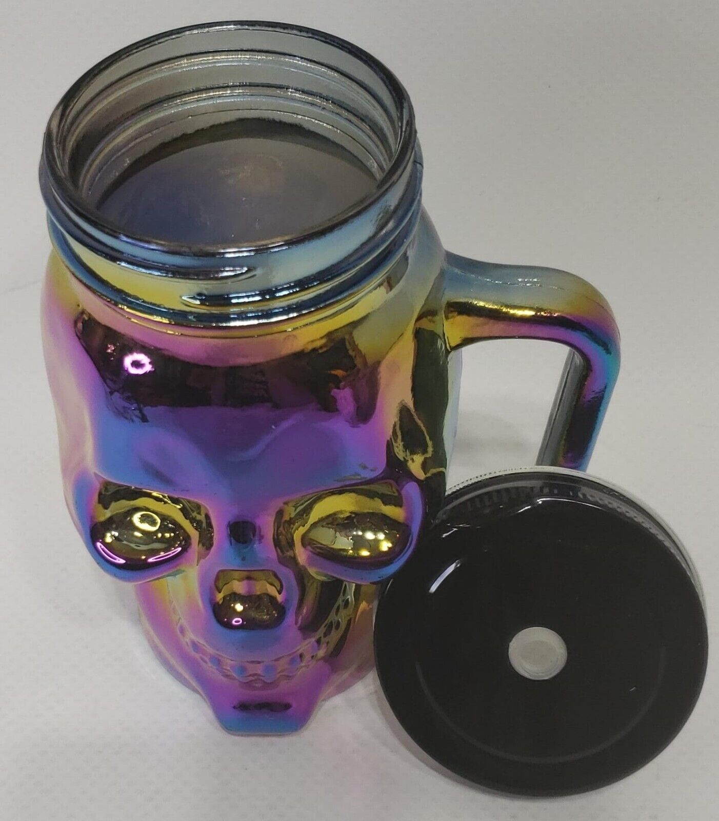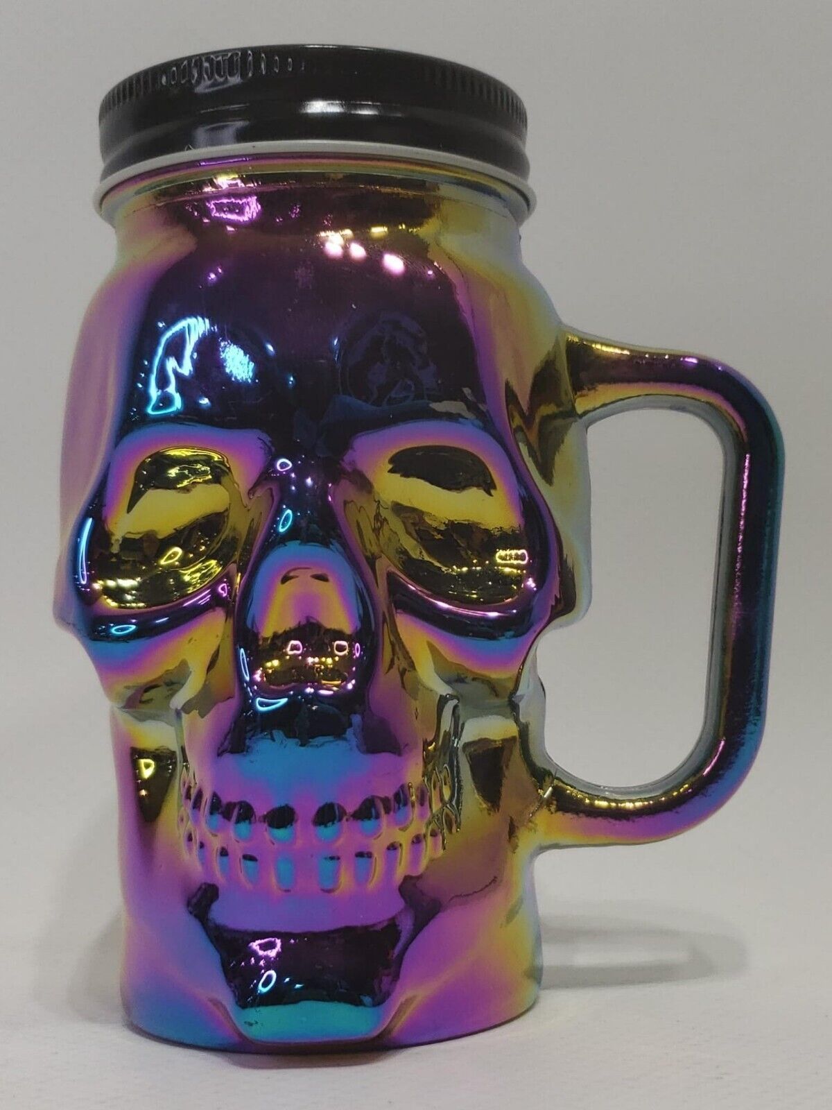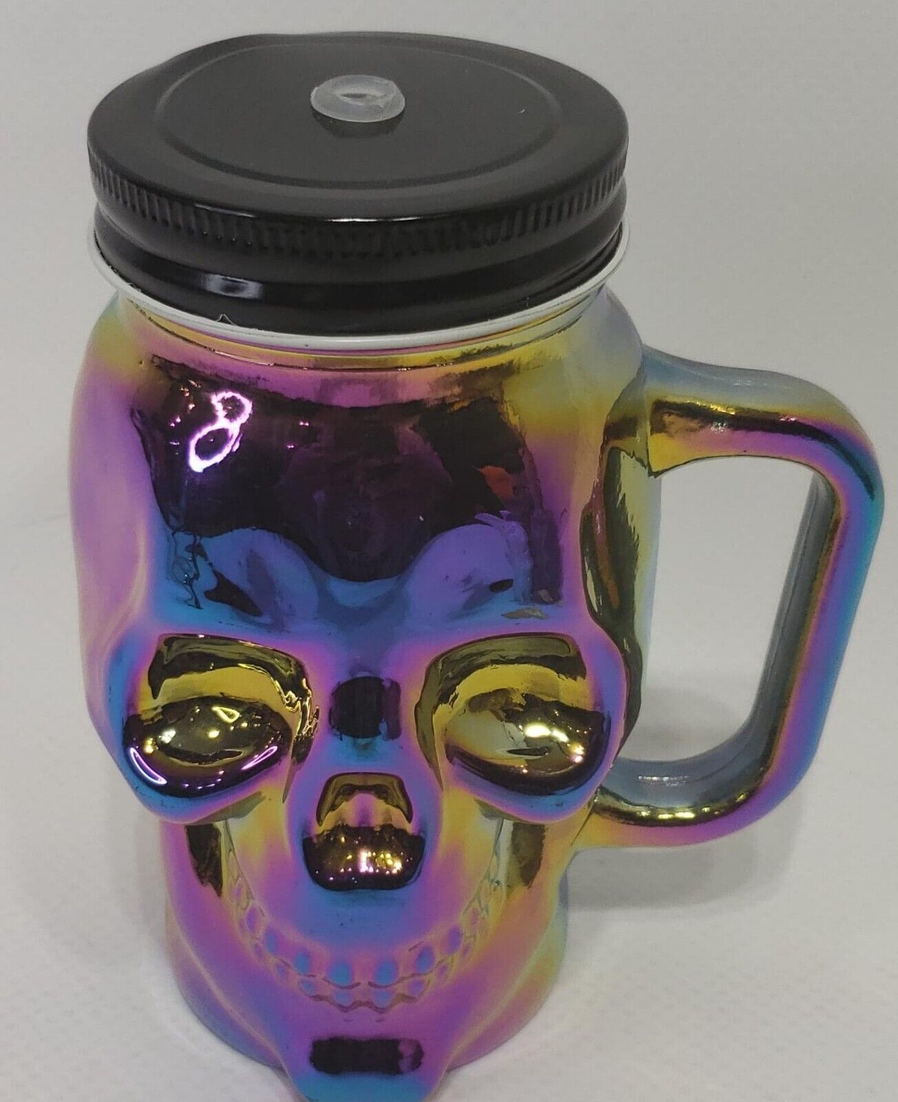 Rainbow Holographic Iridescent Glass Skull Mason Jar with Lid