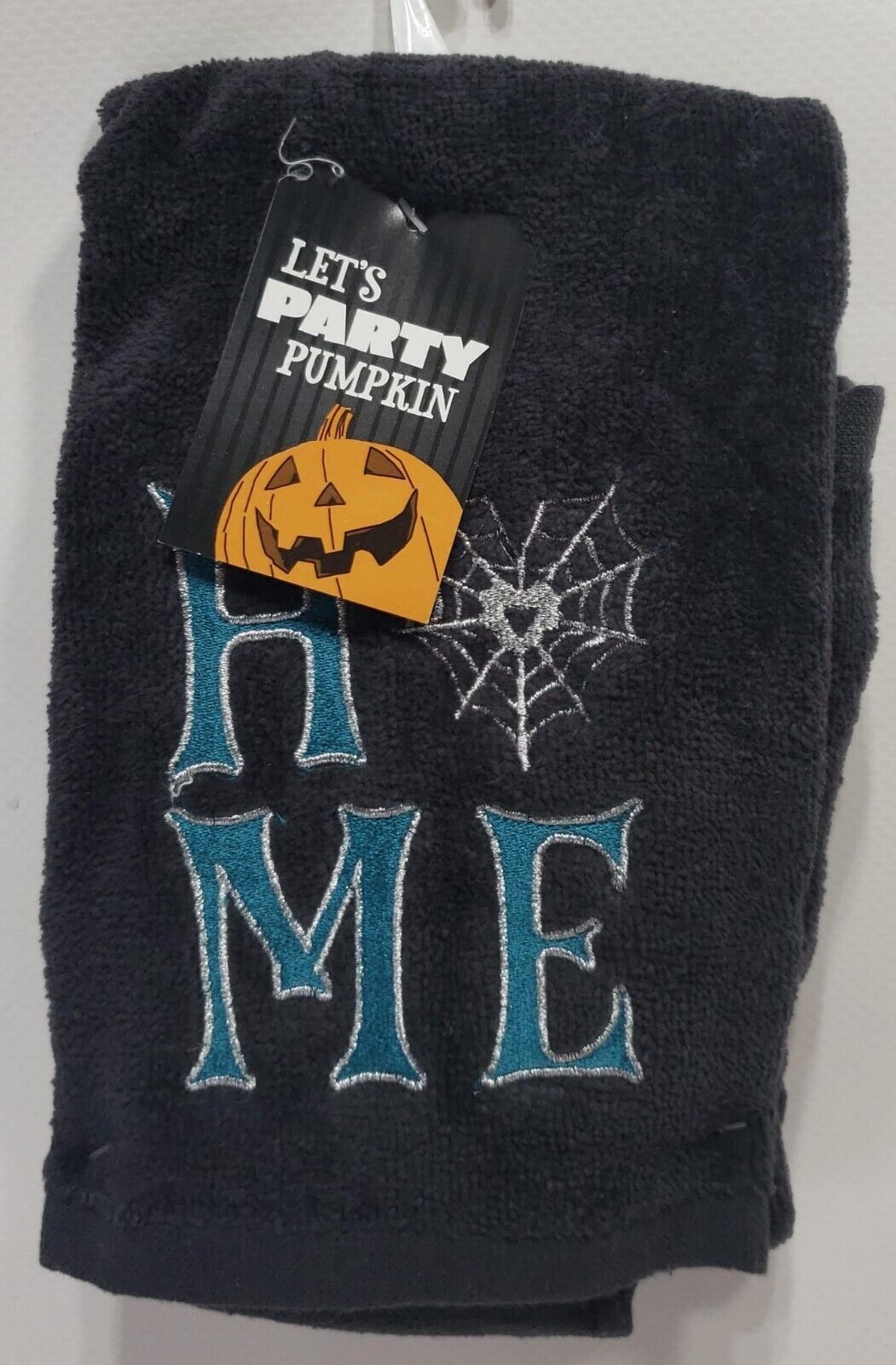 Get ready for Halloween with this fun and festive Lets Party Pumpkin Embroidered Hand Towel in black.