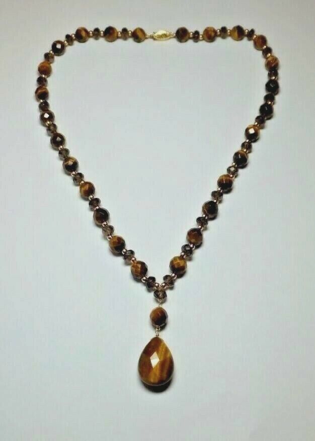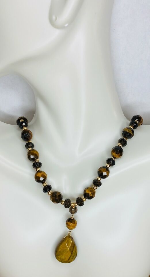 10 Karat Yellow Gold Tiger's Eye & Smoky Quartz & Gold Bead Drop Necklace