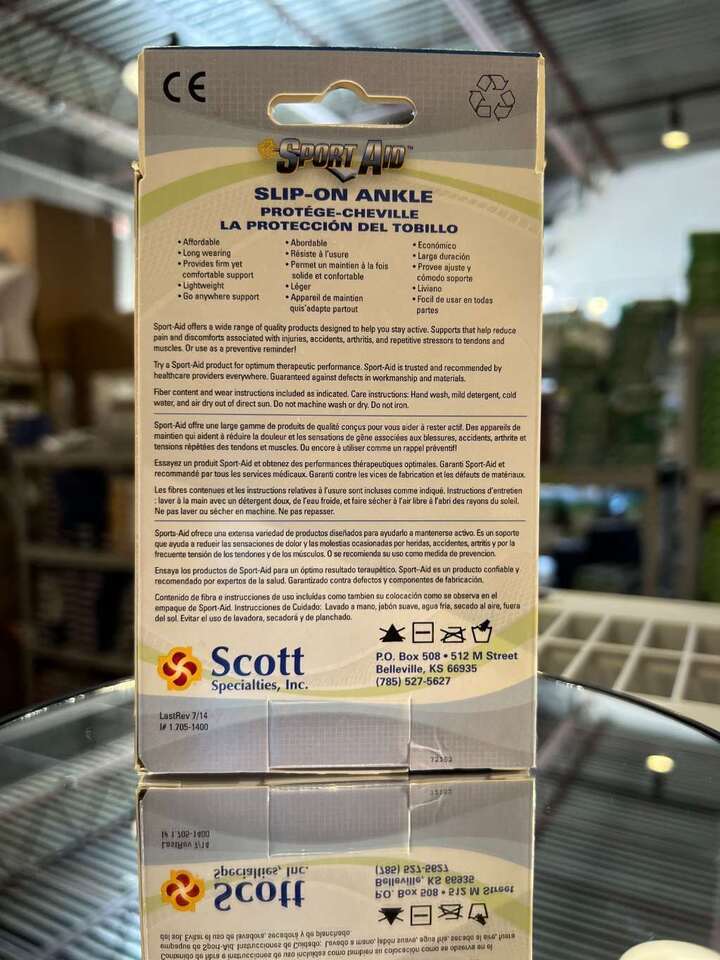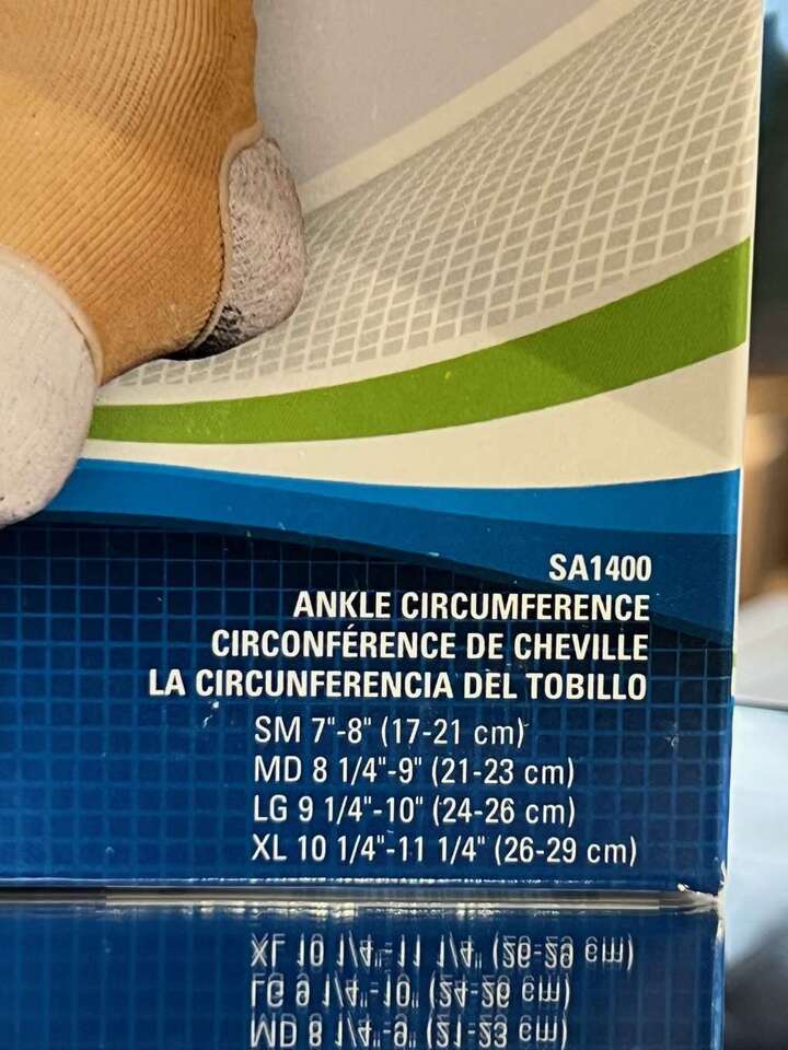 INDICATIONS: Ankle Brace Slip-On Sportaid, Beige, knitted elastic. Has open toe and heel. Provides moderate compression and helps keep swelling to a minimum.