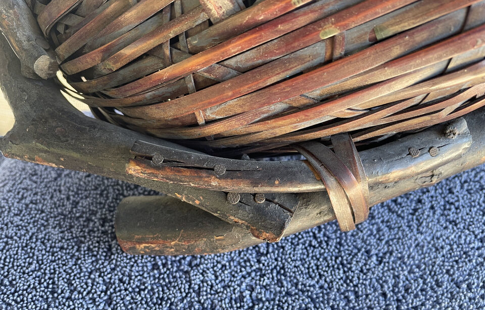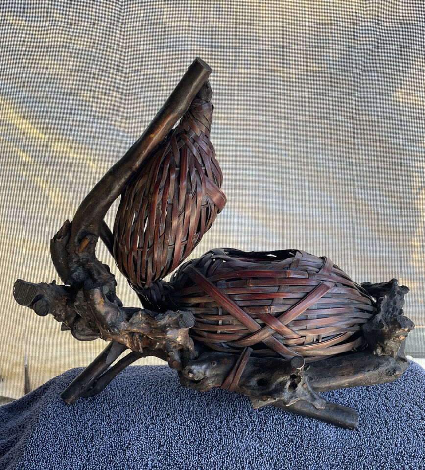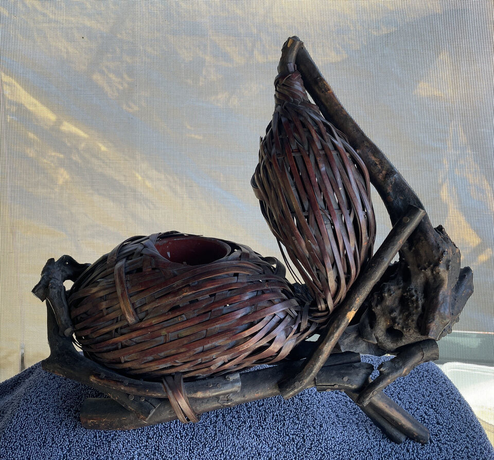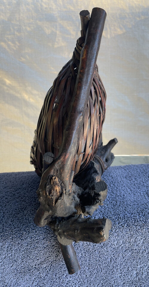 Antique Japanese Double Gourd Ikebana Wowen Basket Vase with Root