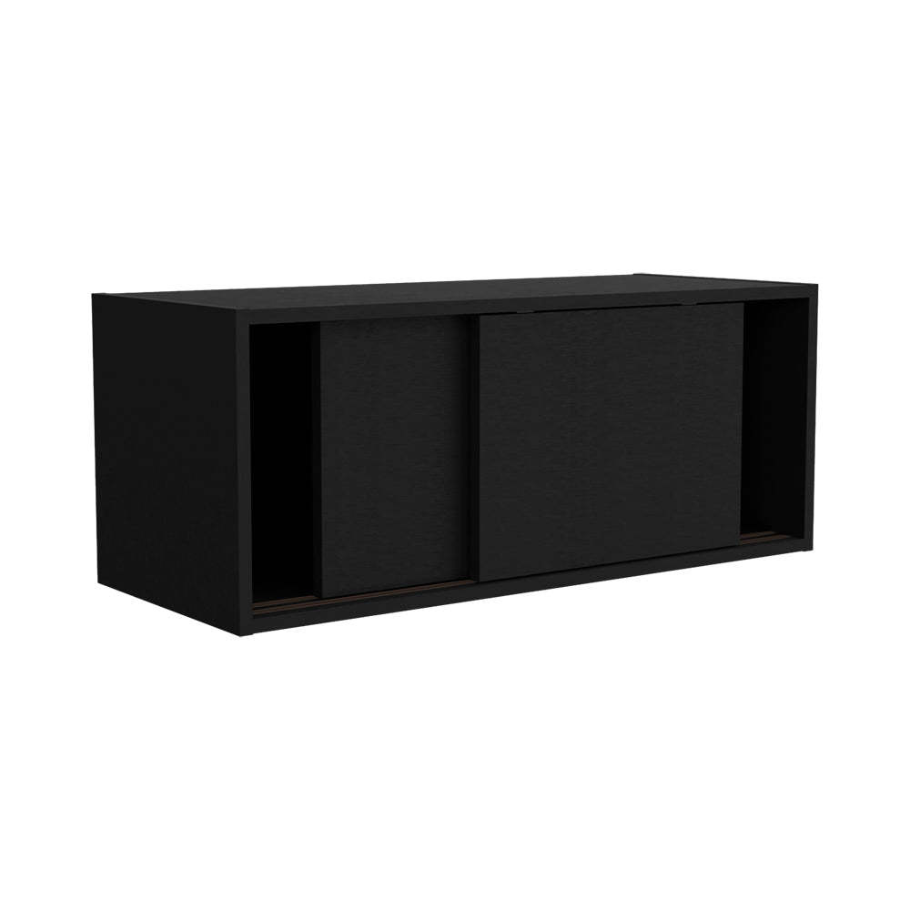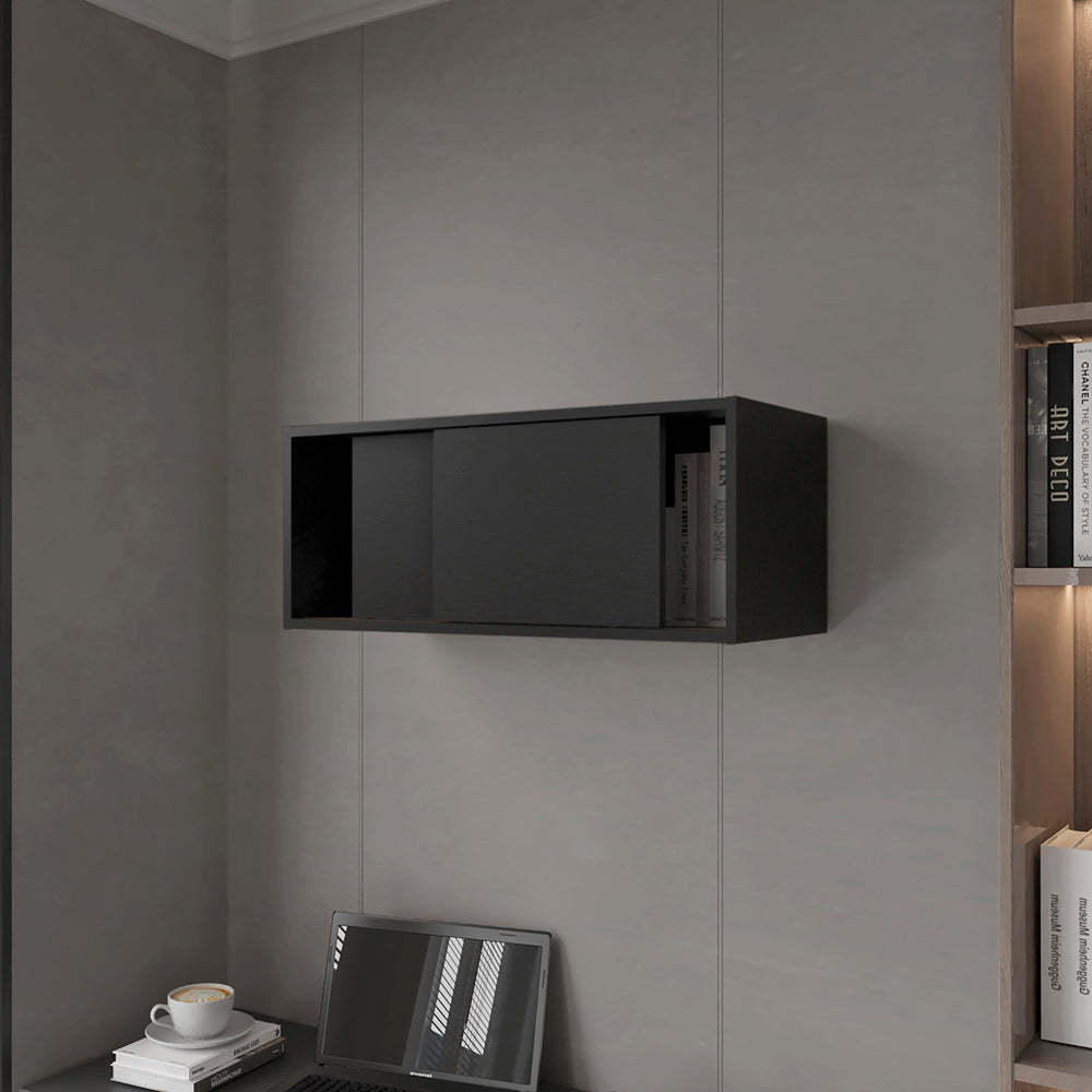 The Wall Cabinet Bliss offers a modern, minimalist storage solution for your office or home workspace. Crafted from durable, black-manufactured wood, this cabinet features a sleek sliding door design, keeping your office supplies, books, and personal items out of sight but easily accessible. An ample interior space measuring 30.7"W x 11.7"H x 12.4"D provides the perfect spot for storing your documents and accessories, helping you maintain a clean and clutter-free workspace. The cabinet supports up to 55.1 lbs, making it sturdy and versatile. Its compact, wall-mounted design saves floor space while adding a contemporary touch to your room decor.