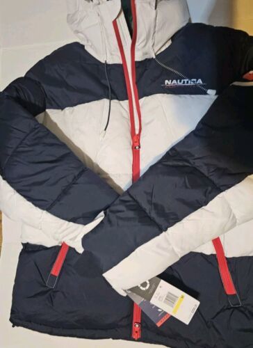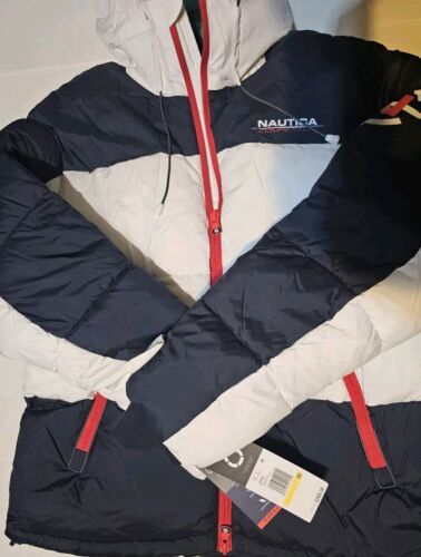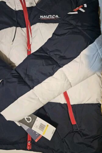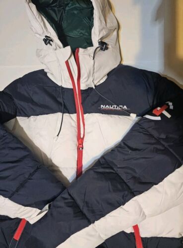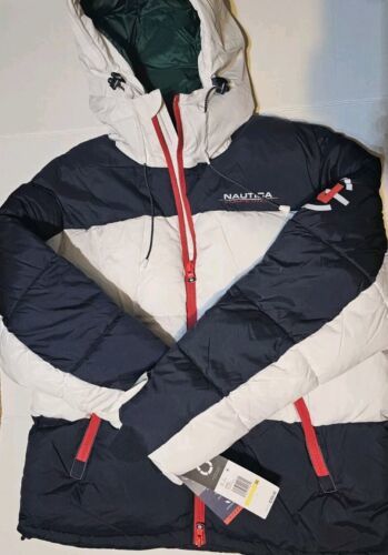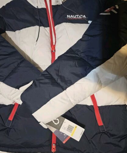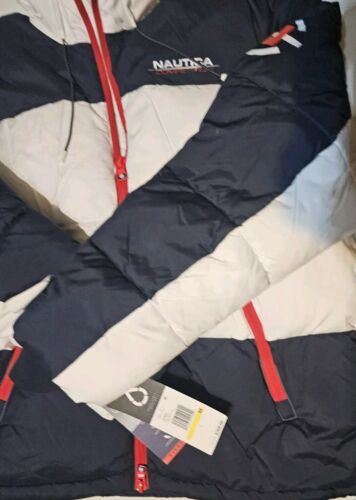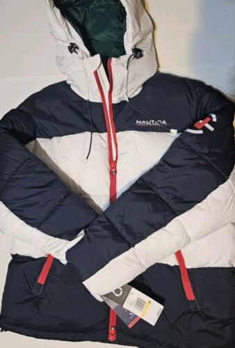 This Nautica jacket is a vintage gem with a striped pattern and colorblock design. The hoodie style jacket is made with a rayon fabric type and features a zip closure. It is perfect for various occasions such as travel, parties, casual outings, formal events, and workwear. The jacket is also reversible, making it versatile and perfect for any activity or season.